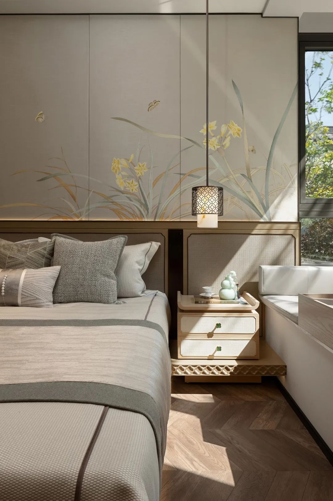 某种程度上,东方禅意的生命力,取决于在地文化与今天时代语境的对话深度。众睦设计相信,这是一种与今天生活方式和融的美学试验,从传统工笔画的运用广度中可见一斑。花鸟形意,古时常常是山水画里的写意几笔,而在设计师笔下,与当代材质交糅,成为休憩空间的诗意背景,渲染一室怡然气息。
