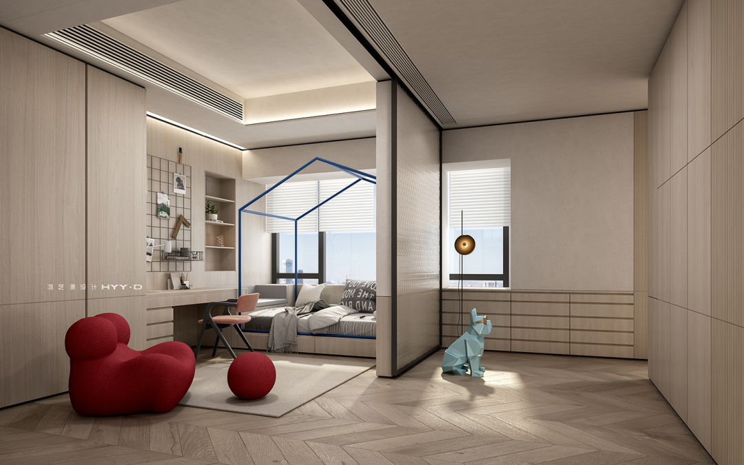 大宝第一次来新家的时候就迫不及待地查看自己的房间,有学习的地方,还有可以安静读书的角落,每一个小摆件都令他感到惊喜和满足。最重要的是,爸爸妈妈原创的“房中房”设计带给他满满的安全感,每一个晚上睡得都很香甜。