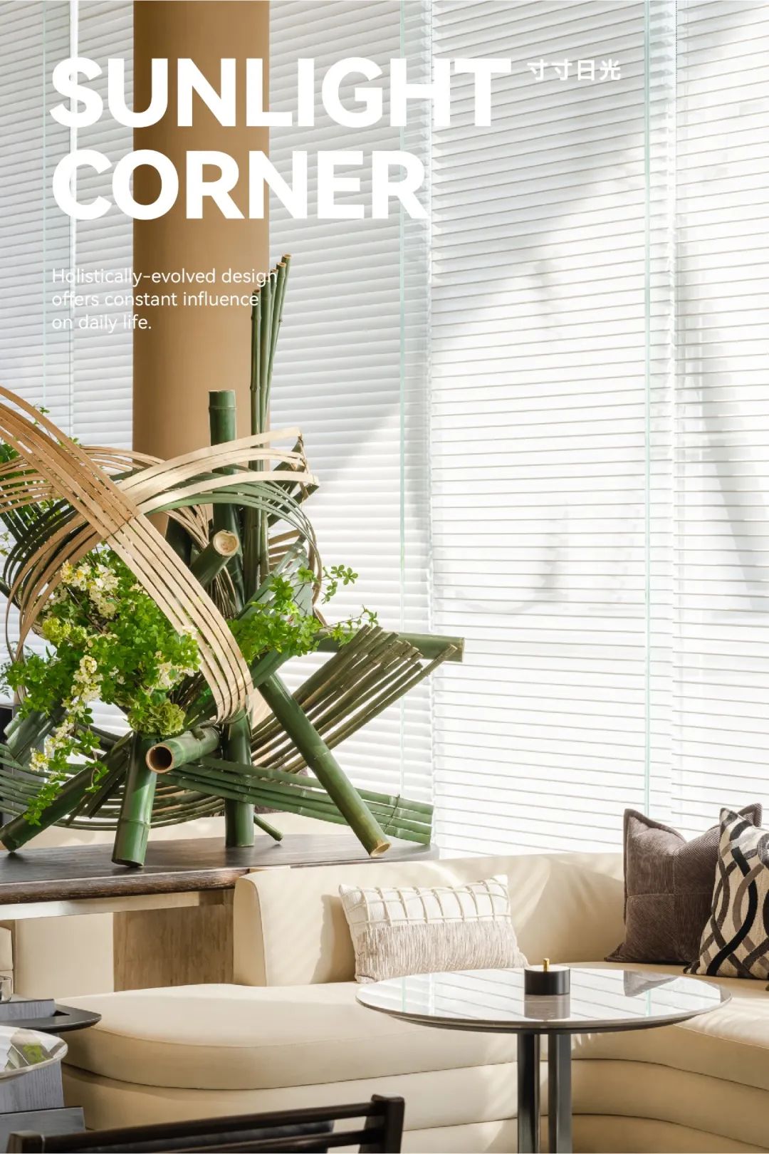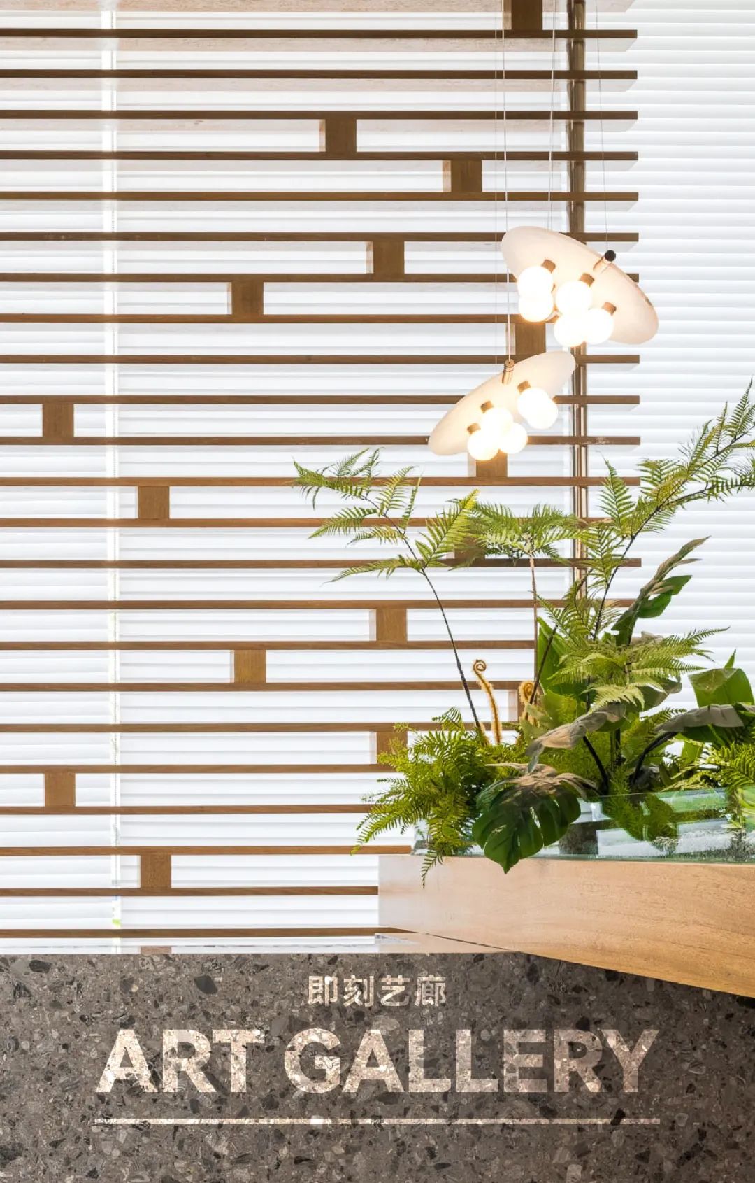在清新的木色肌底中,在百叶帘的有序过滤下,空间的基调里饱含多样化的生命形态,亦开启着这场人与自然、人与空间的对话。由竹节编织的端景小品装置,旋绕交织的姿态演绎自然与艺术共融的节奏,洋溢着隽永的无限生机。