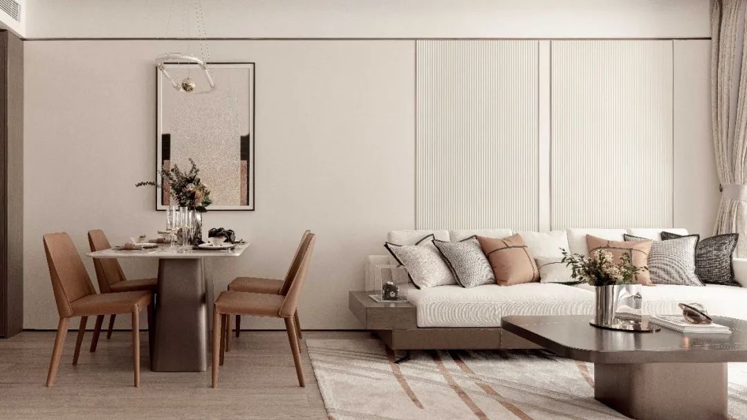 卡其色调的陈设与摆件,在序列中迎合着都会新贵的生活起居,几何线条在明朗氛围中勾勒着生活细节和空间层次感,在递进间回归居家生活的沉浸式体验。