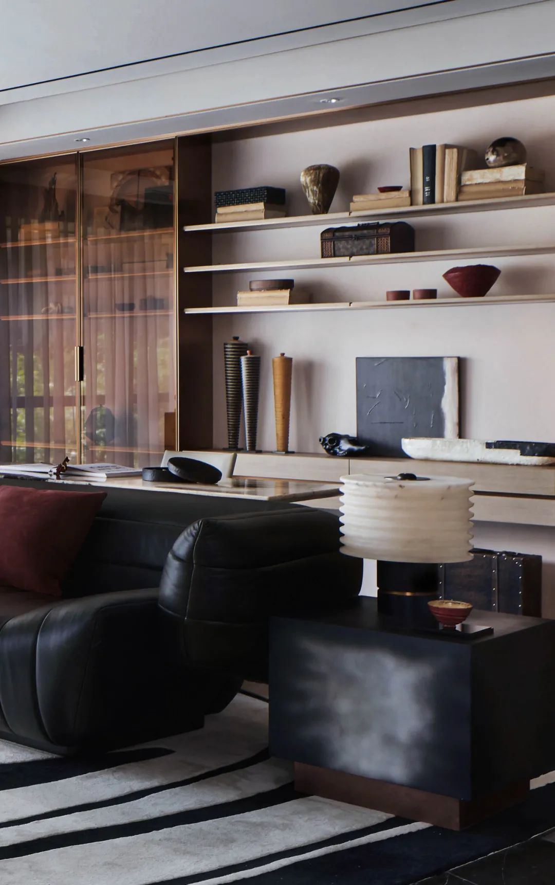 开放式书房作为藏品区,与客厅为邻,延续了极具稀缺性的材质运用,营造一种由表及里的尊贵感,从书卷、陶瓷到漆器、霜色琉璃,浓厚的艺术气息呼之欲出。