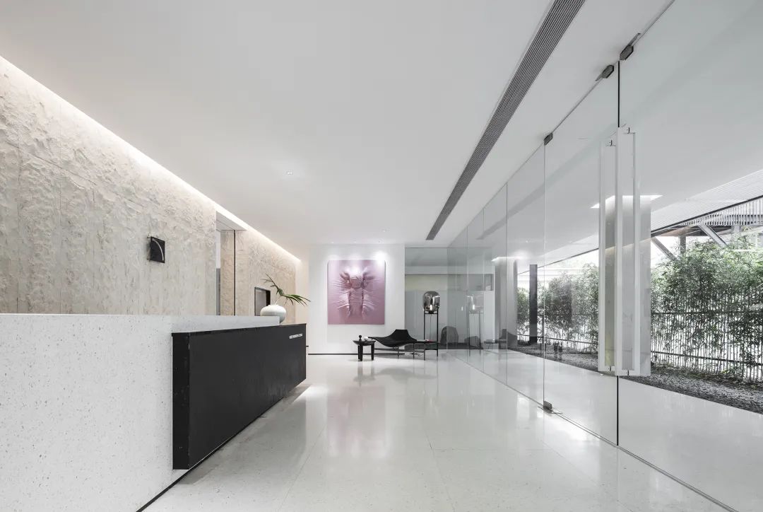 在美林设计看来,一个艺术馆的核心,在于人群行进动线与空间结构、艺术氛围的自洽,人与艺术在其中产生的关联和共鸣至关重要。这与其办公空间所营造的专业化场景亦相近,设计师以简约的笔法描摹出大致轮廓,以区别于白且与白对比的艺术品沿路烘托,一转弯一特色,引人入胜。