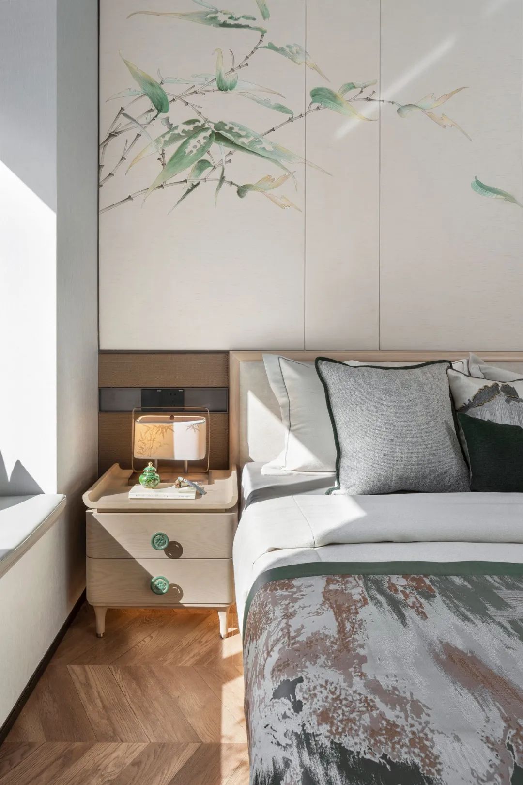 含蓄雅致的黛蓝色床品,印有细腻的纹路与水墨肌理,彰显出精湛而细致的设计语汇。台桌上的一株清幽兰花,与绽放于墙面的水墨花枝形成呼应,一缕清香,于含蓄内敛的东方意韵中弥漫开来,沁人心脾。