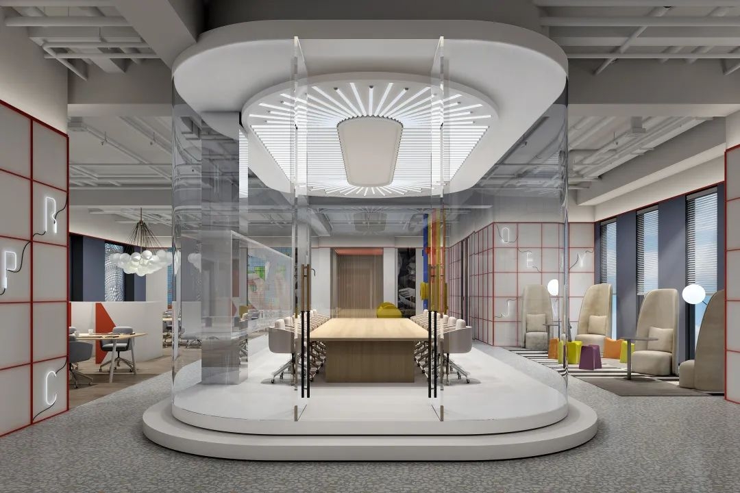 本案的设计始于对科技变革与未来交流方式的理解,设计师将其当成一个整体的艺术品来打造,将展示空间变成艺术空间,同时加入现代人文元素,整个室内呈现出高度开放性、透明性、艺术性,这不仅仅是一个供人观赏的空间,它还可以被触碰和体会。近乎纯白色调扩容视觉,通过光影、材料、线条的相互关联,体现多样变化,为观众营造出不同的感官体验。旋转的魔方象征着变化与想象,同时表达了纯净与过滤后的空间二元性,是对科技、未来、设计的解读。