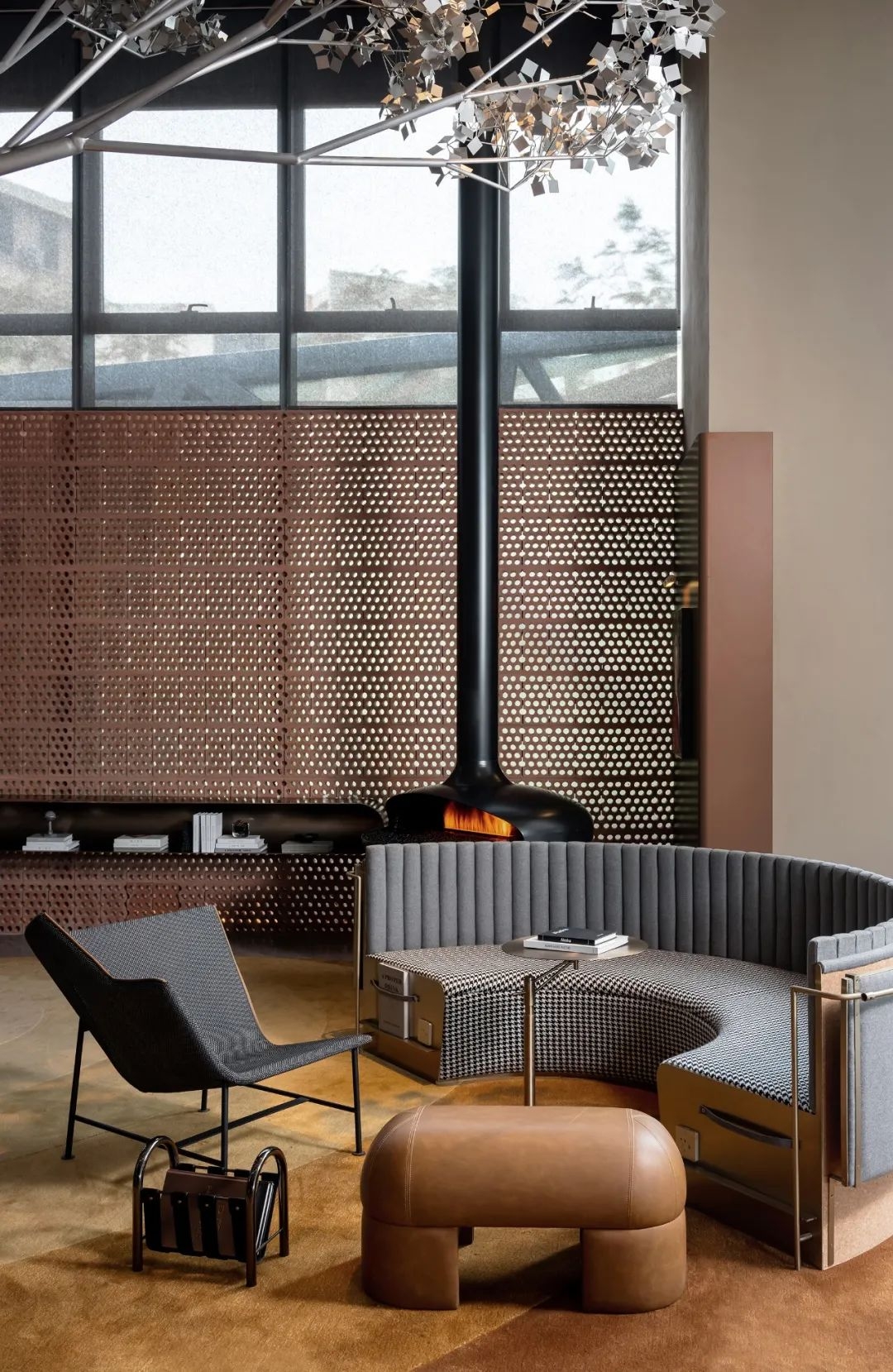在此,设计模拟了一幅富有创意的生活框景:在半围合的沙发座椅与优雅时髦的个性单椅之外,一面是新科技感的艺术装置树,一面是具有年代气息的红砖瓦墙与熊熊火炉。新旧的碰撞焕发着十足的空间张力。