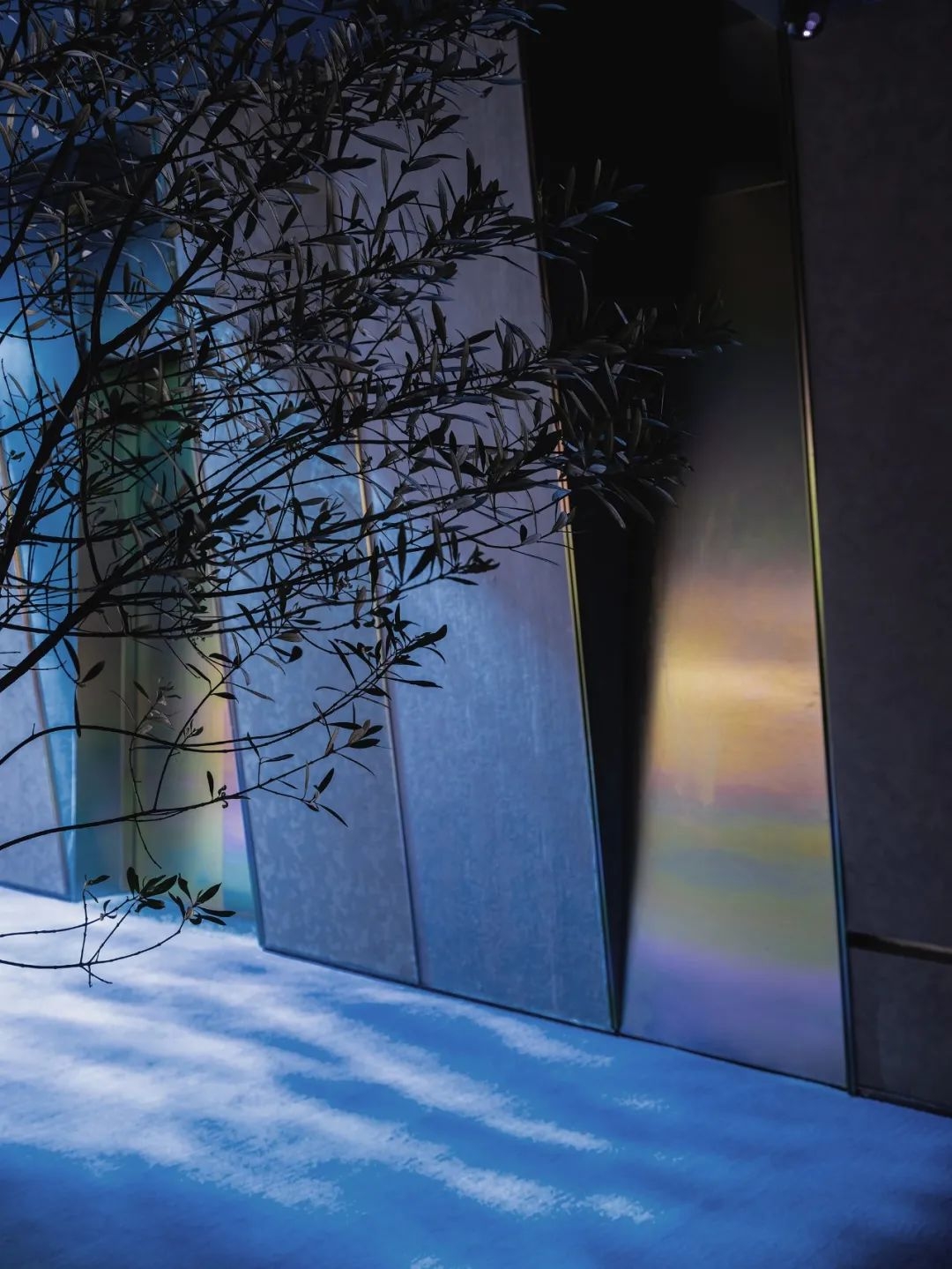 波光粼粼的光影变幻、不规则的切面构造,设计师在造型与布景上以独特的表现形式,营造出电梯厅的艺术气质。同时,在材质的打造上,设计运用彩钢板搭配浅色扪皮呼应空间的朦胧构景,烘托出新浪潮的文化氛围。