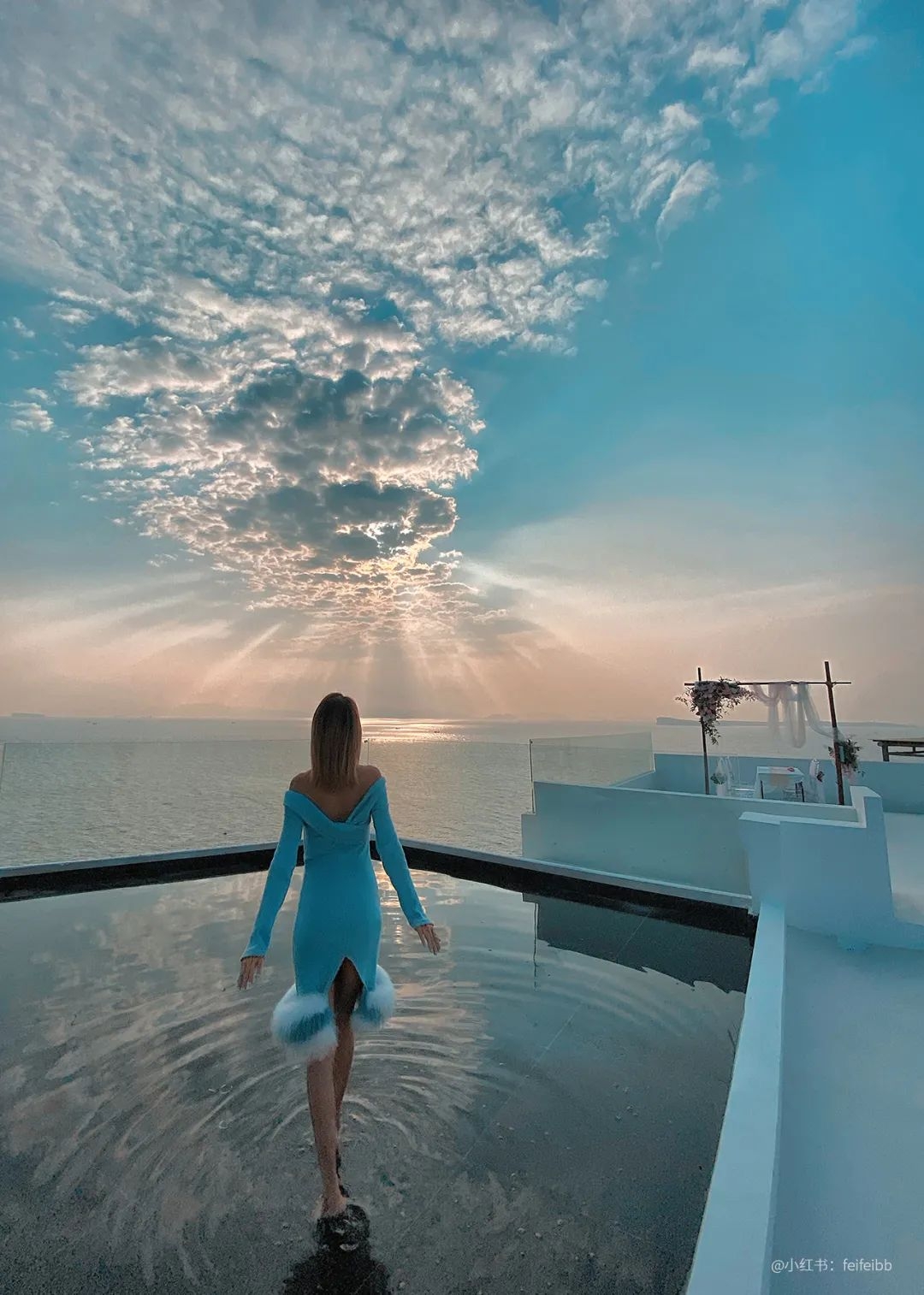 海与远天衔接,犹如一片无垠而繁茂的牧场,白浪闪着琉璃瓦的光泽徐徐涌来,近处错层叠落的白房子呼应着海岸线的叠石小丘……人在这样一片纯粹而浓郁的蓝色之中,感受纯粹的自然与色彩间流露出的澄澈与美好。