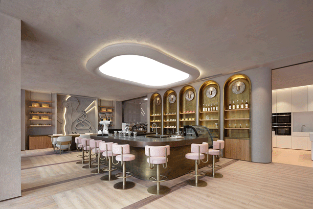 定位为预见城市和未来社区生活的社交聚场,JLa设计集团对本案的规划,在售楼处的基础上叠加商业业态,聚焦仪式感,使之以现象级的打卡式流量场景,更广泛地展现美好而人性化的未来生活图景,驱动社区商业运营新模式的转化,恰如其分地触发人们对生活新体验的期待。透明橱窗式的烘焙区与咖啡吧,极大地丰富了空间内部的层次,同时沿街设置出入口,增加多元可变的场景,吸引行人的好奇与停驻、互动。
