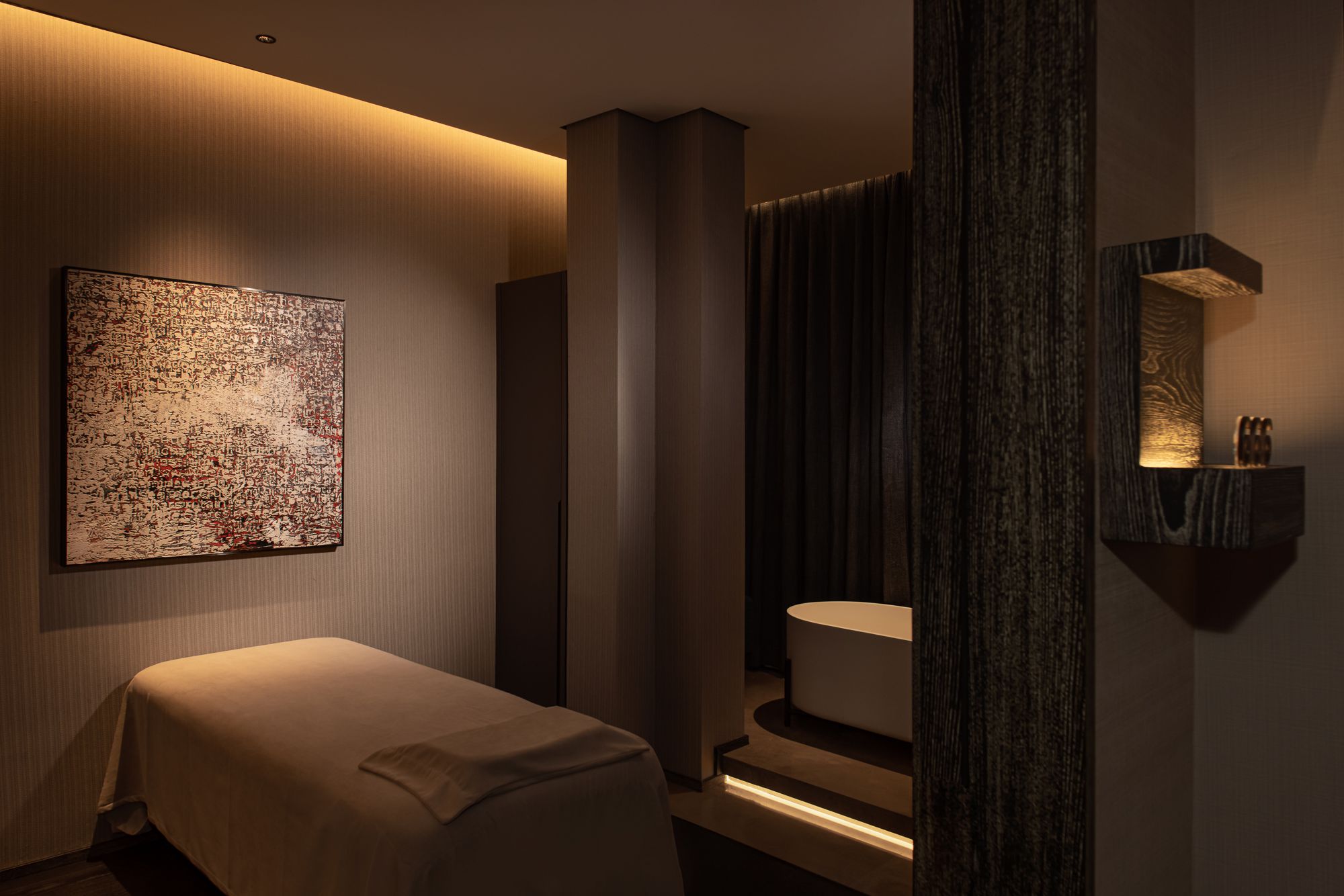 格栅、墙面肌理、悠悠淡光迎面而来,人们瞬间便被Spa空间释放出的安适舒惬之感包裹。“在生活方式的营造中,体验与感受,作为一种不可忽视的力量,总是在影响着人们的决策,并直击人心。”