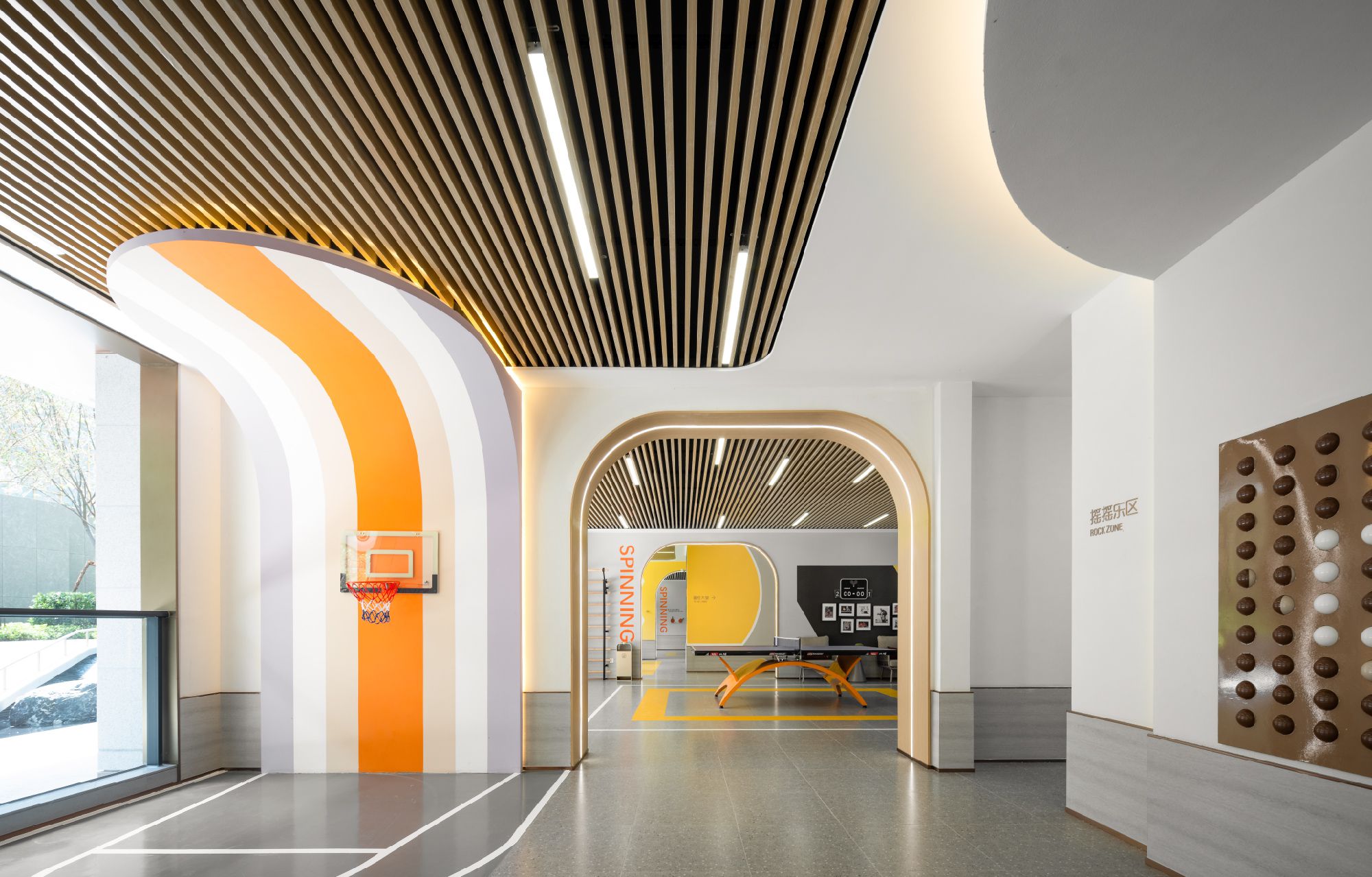 为孩子们打造的室内小型篮球场,契合使用者的玩乐状态,设计师以碰撞的色彩赋予空间灵动的节奏感,明亮的线条灯隐藏在栅格条纹吊顶中,曲面异形的篮板暗合地面的球场界线,在保障安全之余为孩子的快乐运动预设更多趣味。