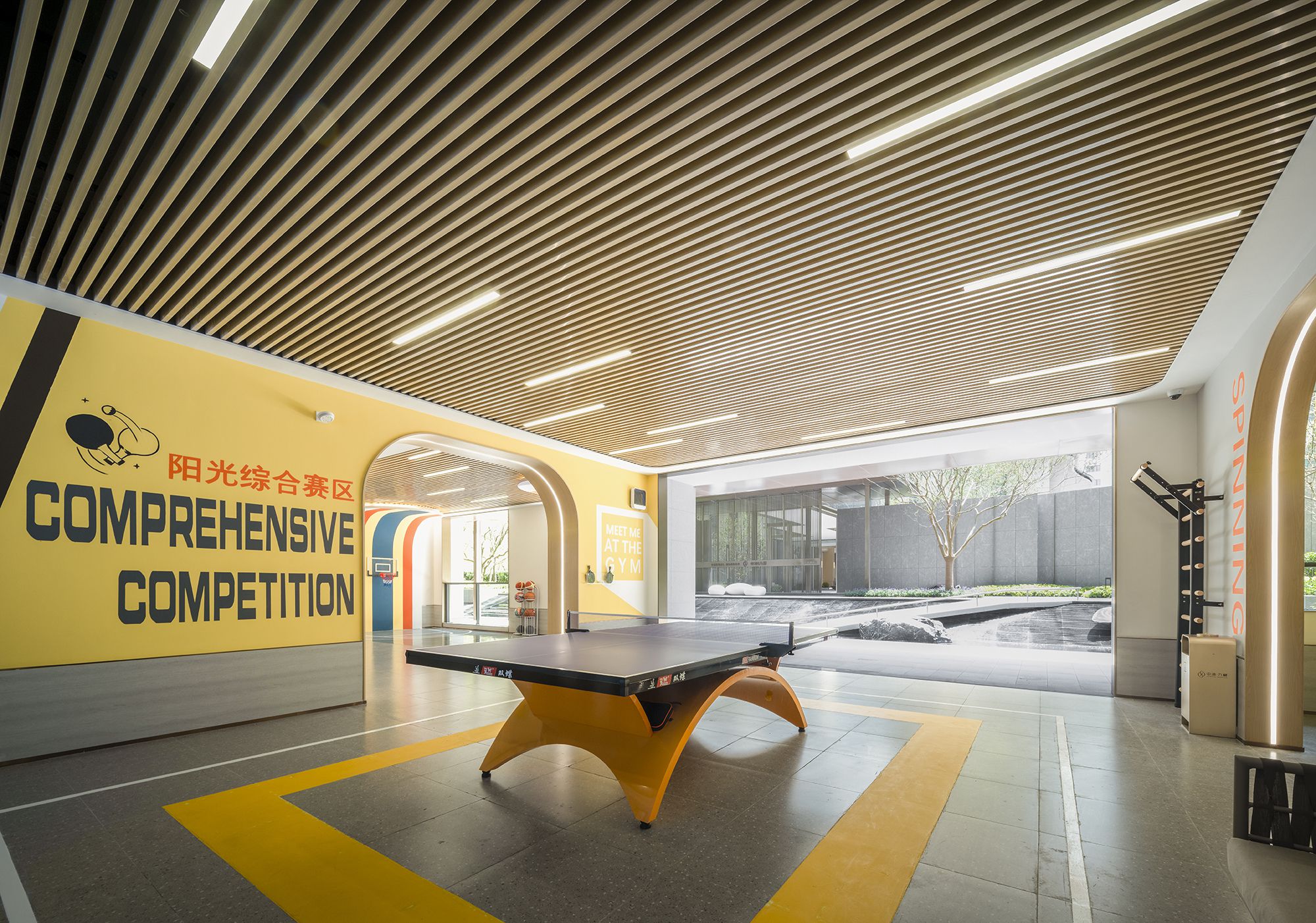 居家之外的运动生活在丰富多彩的乒乓赛事对决中展现,淮安中海·九樾架空层个性潮流化的空间营造,让健身区域成为社区中互动空间最受欢迎的版块。立面丰富的元素符号化为视觉引导,串联专项运动划分的空间功能板块,让使用者面对自然的健身新场景,随时随地融入健康生活。
