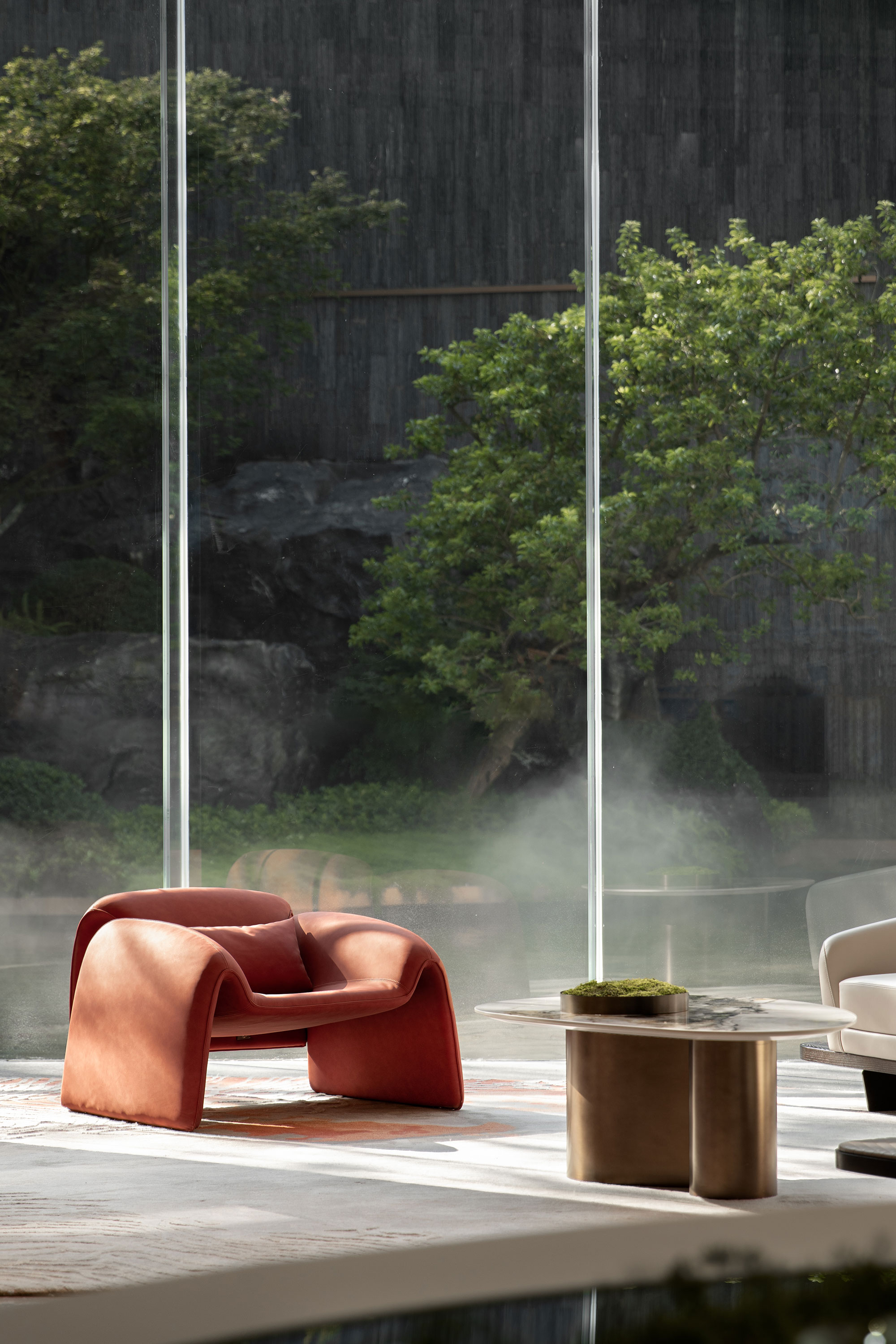 茶花的抽象化形,与当代工艺的结合,成为室内设计层次鲜明的亮点。“在当代语境下的茶花,已不仅仅是形姿优美的花卉,更是一个象征着高贵优雅的全球符号。我们希望通过茶花主题,与项目的地域特质、产品格调双重契合,达至外在与内在的美学合一。”设计师如是说。