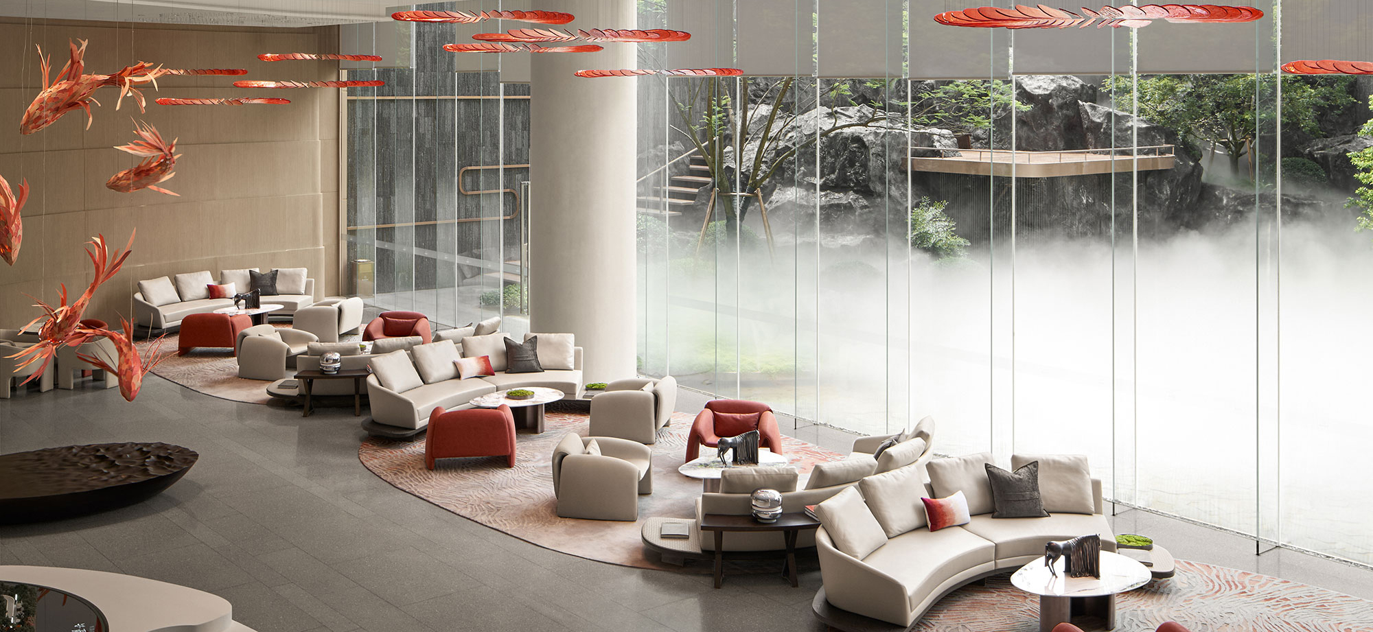 洽谈区延续了简雅静逸的气质基底,栩栩如生的数只锦鲤嬉戏、游走于半空,在微妙的灯光下,为空间注入一抹灵动的趣味。与锦鲤色呼应的艺术吊挂,则来自对茶叶与茶花一脉相承的演绎,在渐变美学的流动形态下,与户外雾气氤氲、树木葱郁的景观情境相映成趣。