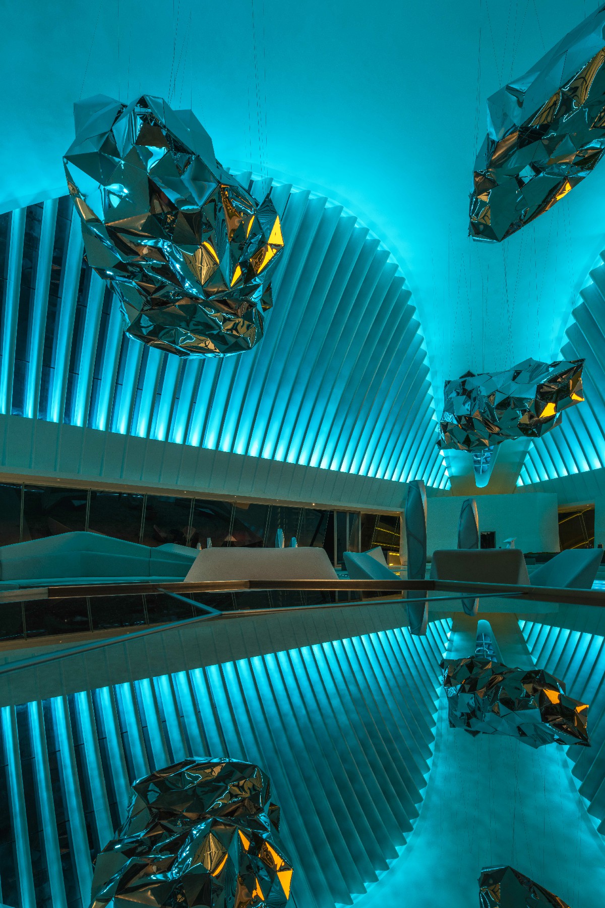水波纹镜面不锈钢,描摹天际夜幕的奇妙变幻。仿砂岩微粗的柔光肌理,蜿蜒游走,堆叠层次编排的浪漫。竹藤交织半围,限定区域但保留视觉效果的开敞,顺势构建空间内的聚合印象。