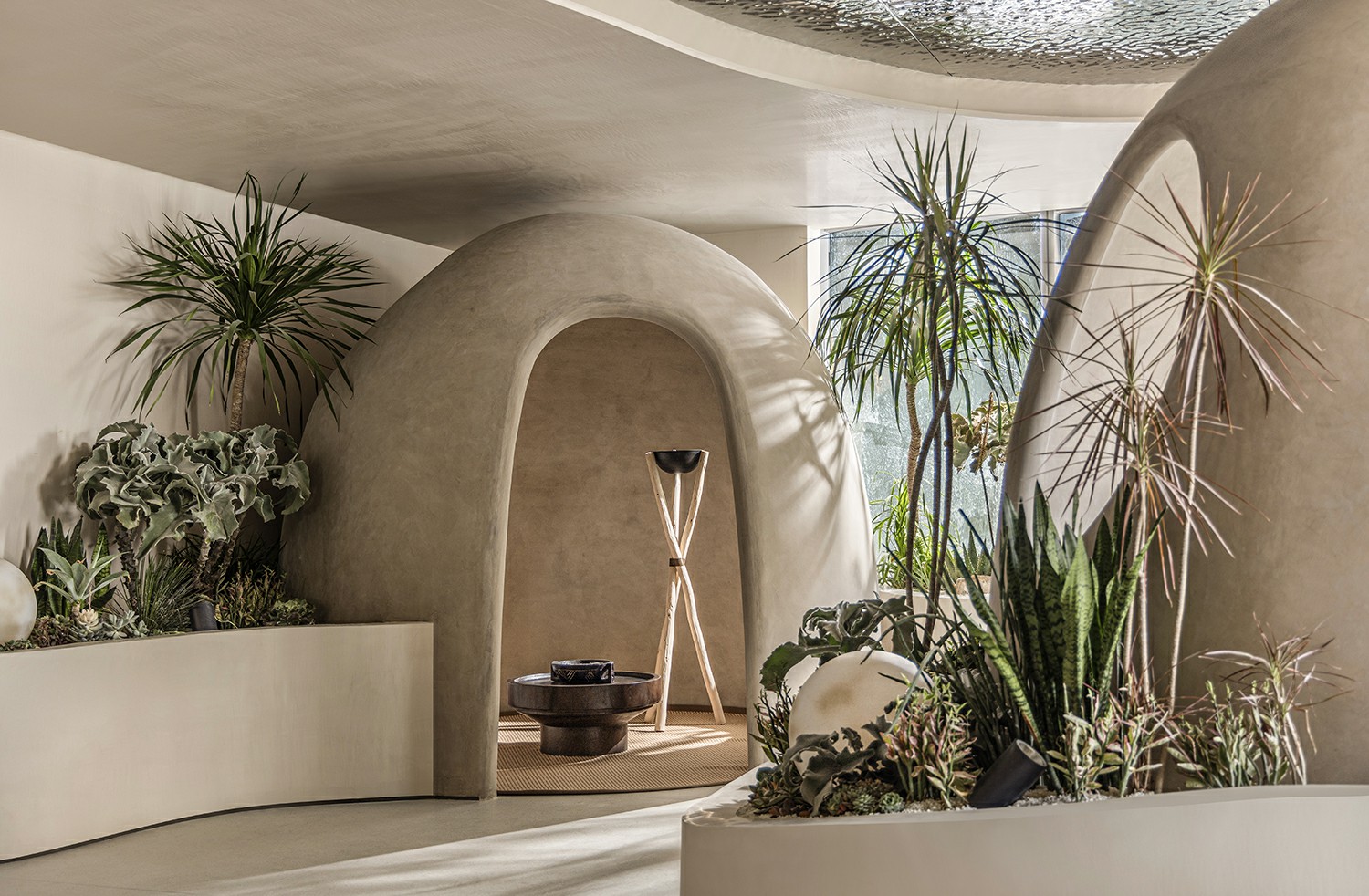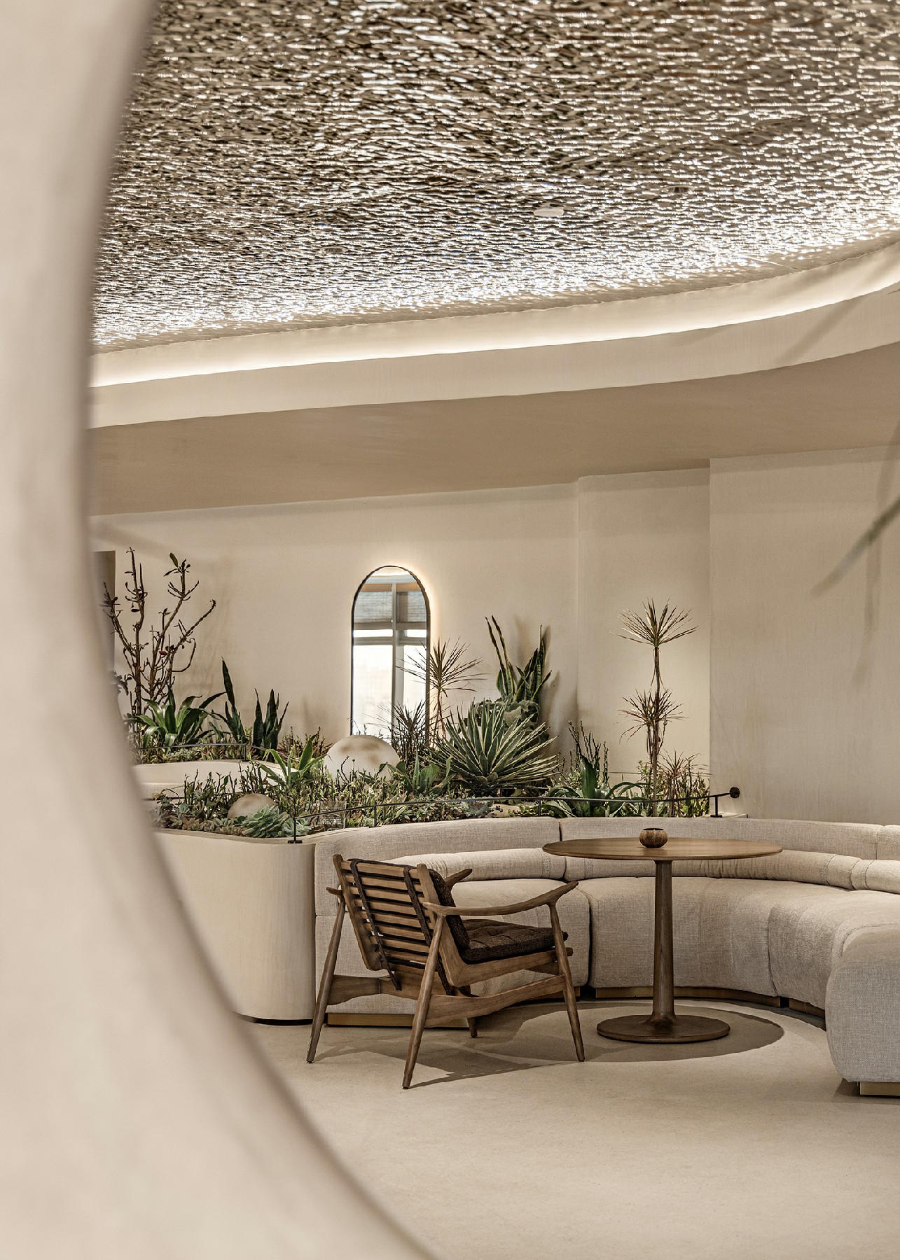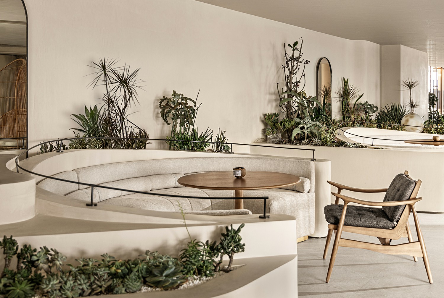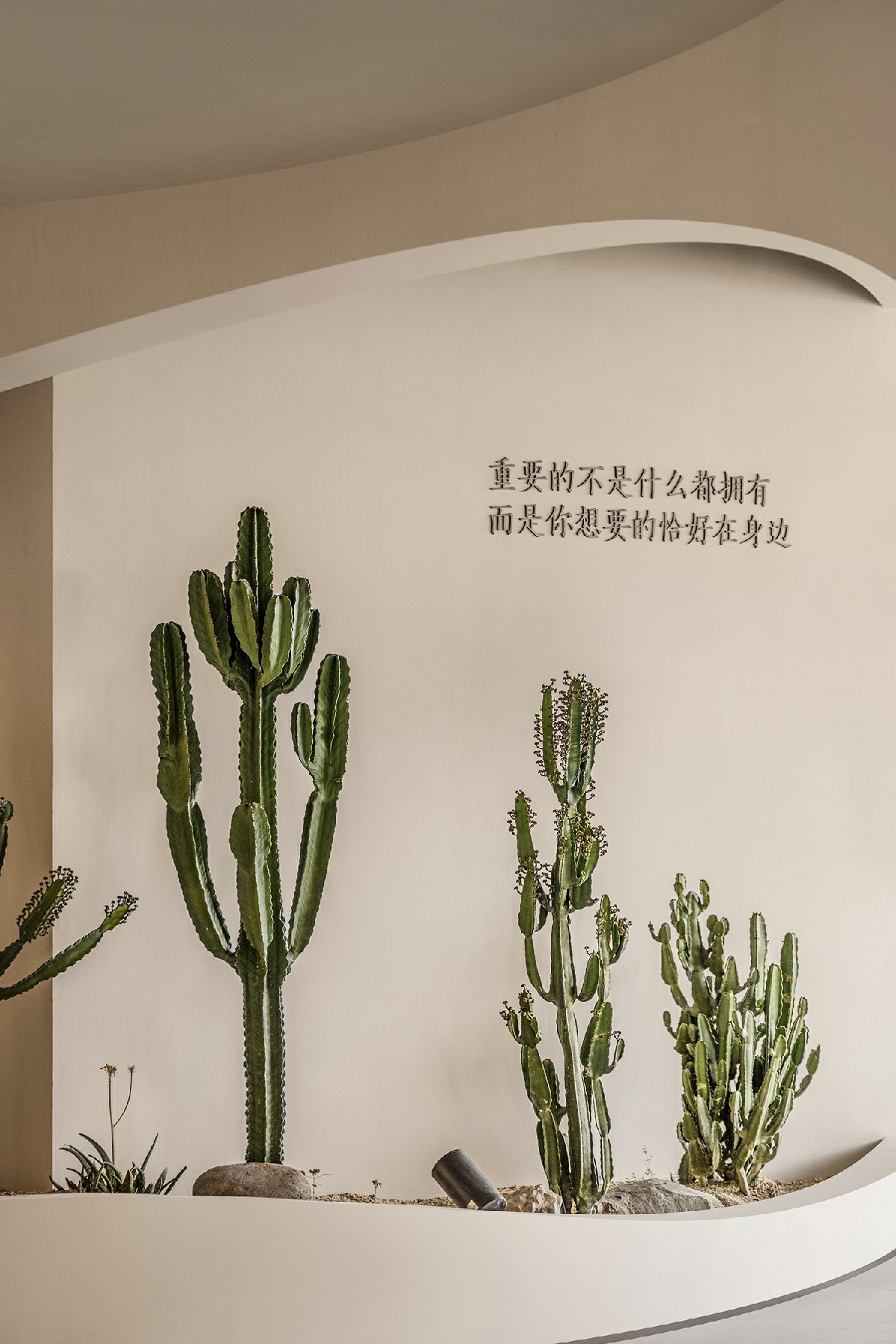 延续一楼植物自然生态架构,简洁铺陈创设新颖且带有平面意味的体验感。仙人掌、多肉植物等自然元素,唤醒人对空间的觉知,于每个细致末微的角落渗透静谧气息。