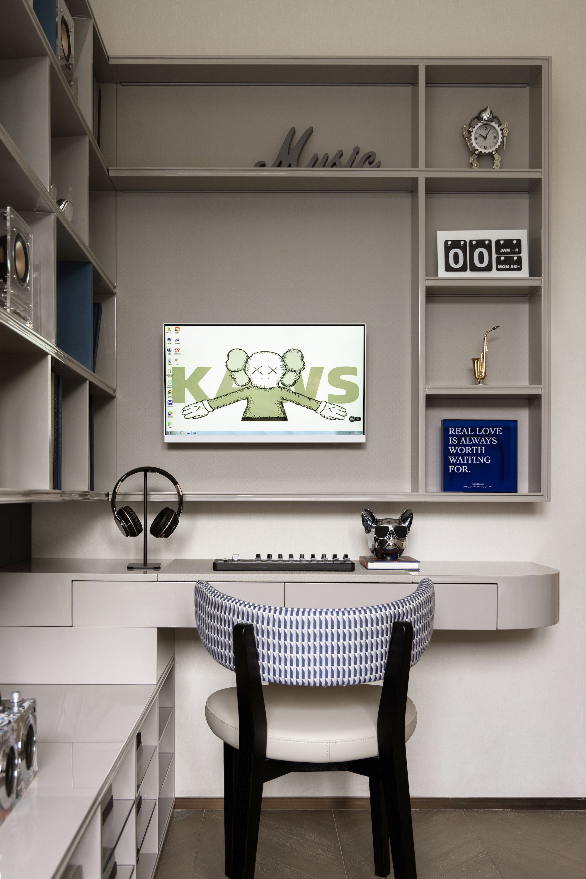 潮趣无界,心域无疆。对Kaws潮玩元素的解译、创新,对当前各式潮流符号的收藏,成为男孩房的设计亮点。蓝白经典设色,井然有序的收藏柜,颠覆日常的艺术性......先锋视觉之美,每一天皆在此间上演。