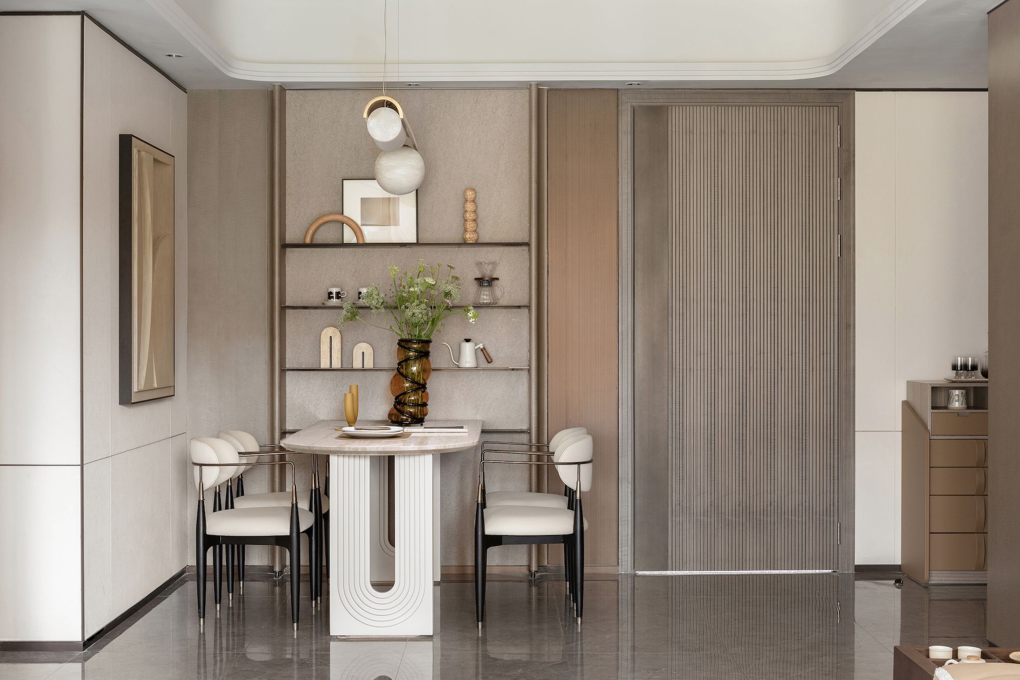 客厅、餐厅、书房、厨房四合一的无界连通,社交盛宴的流动性,与空间的家具曲线、双向风光、典雅意涵和融呼应。人间烟火气,不拘于方寸之内,流转于餐桌、沙发、书案、茶几、艺术画等每一处,精奢气息自由萦绕,澎湃诗意俱在眼前,流入内心。
