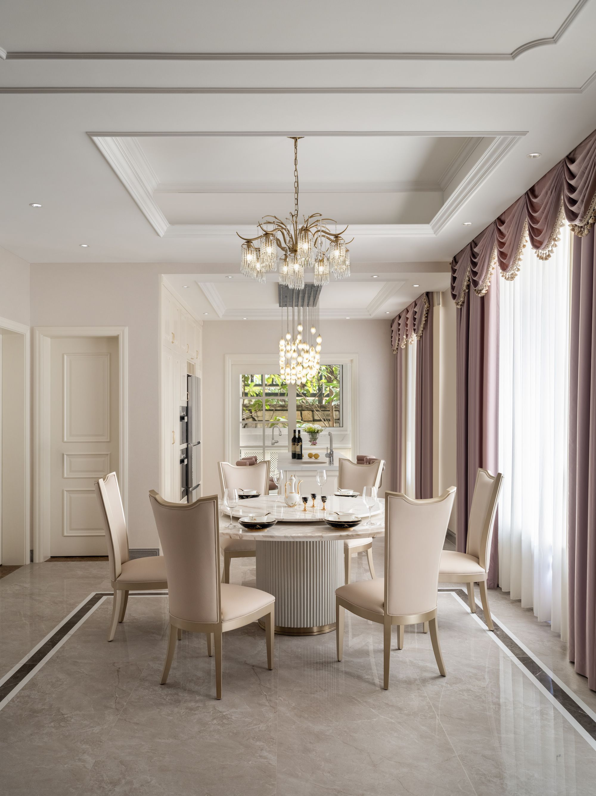 删繁就简的当代化演绎,让美式轻奢的古典美学更添一层时代语境的前瞻性。在会客厅的场景里,设计师将色彩的明度与情绪相结合,温柔的珍珠白,渲染出立体雕花的质感,加之雾蓝调与金属材质的强烈对比,空间颇具唯美时尚之感。