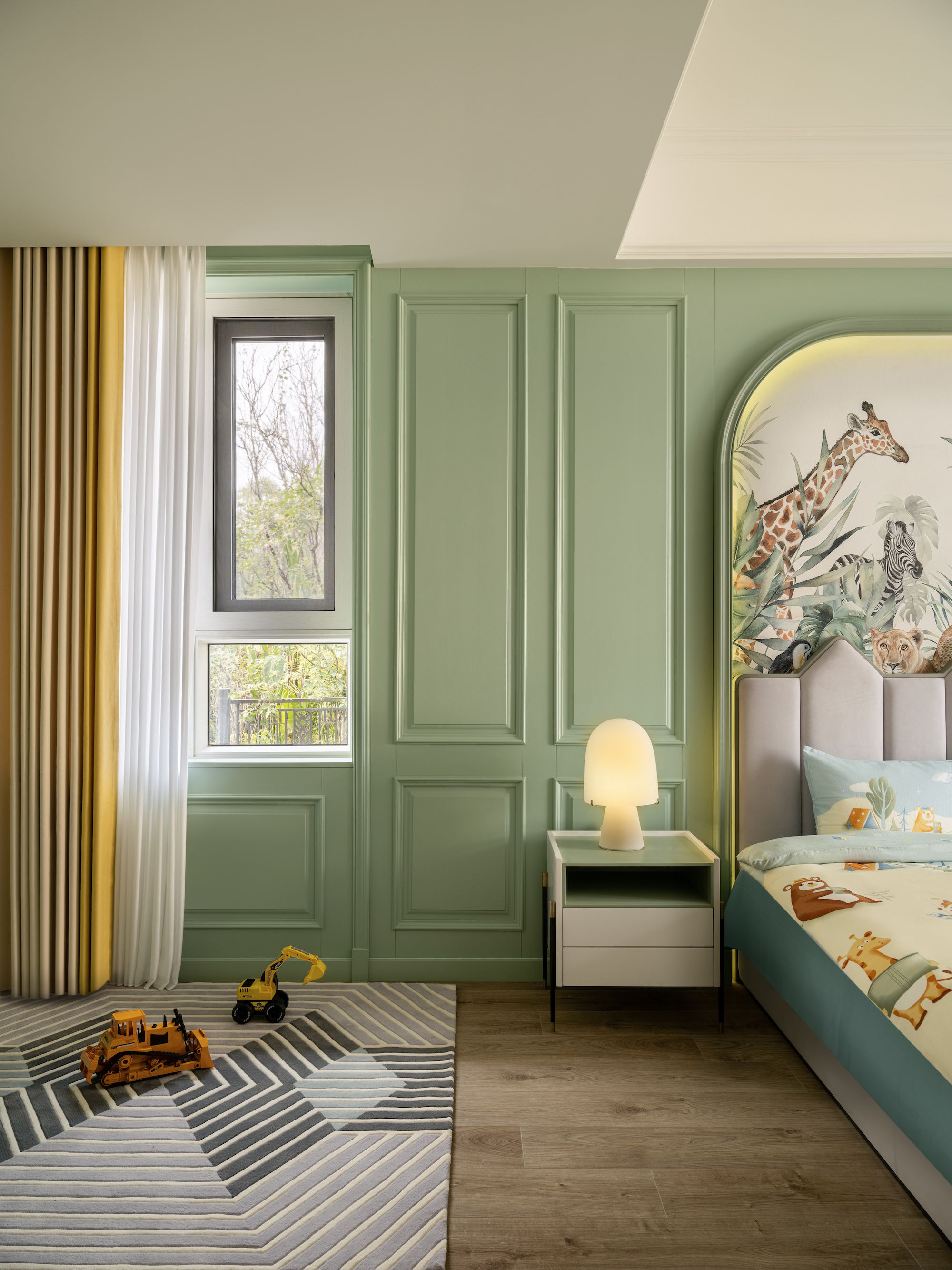 漫游于静谧森林,自然生灵、繁花与丛林触手可及,设计师以森系梦境的语素包裹着儿童房的内核。清新而生机勃勃的浅绿,成为儿童房主色调的来源,设计师将梦想的力量融注于自然与艺术的叙事里,为小小居者造梦,亦为空间刻入乐于探索的精神。