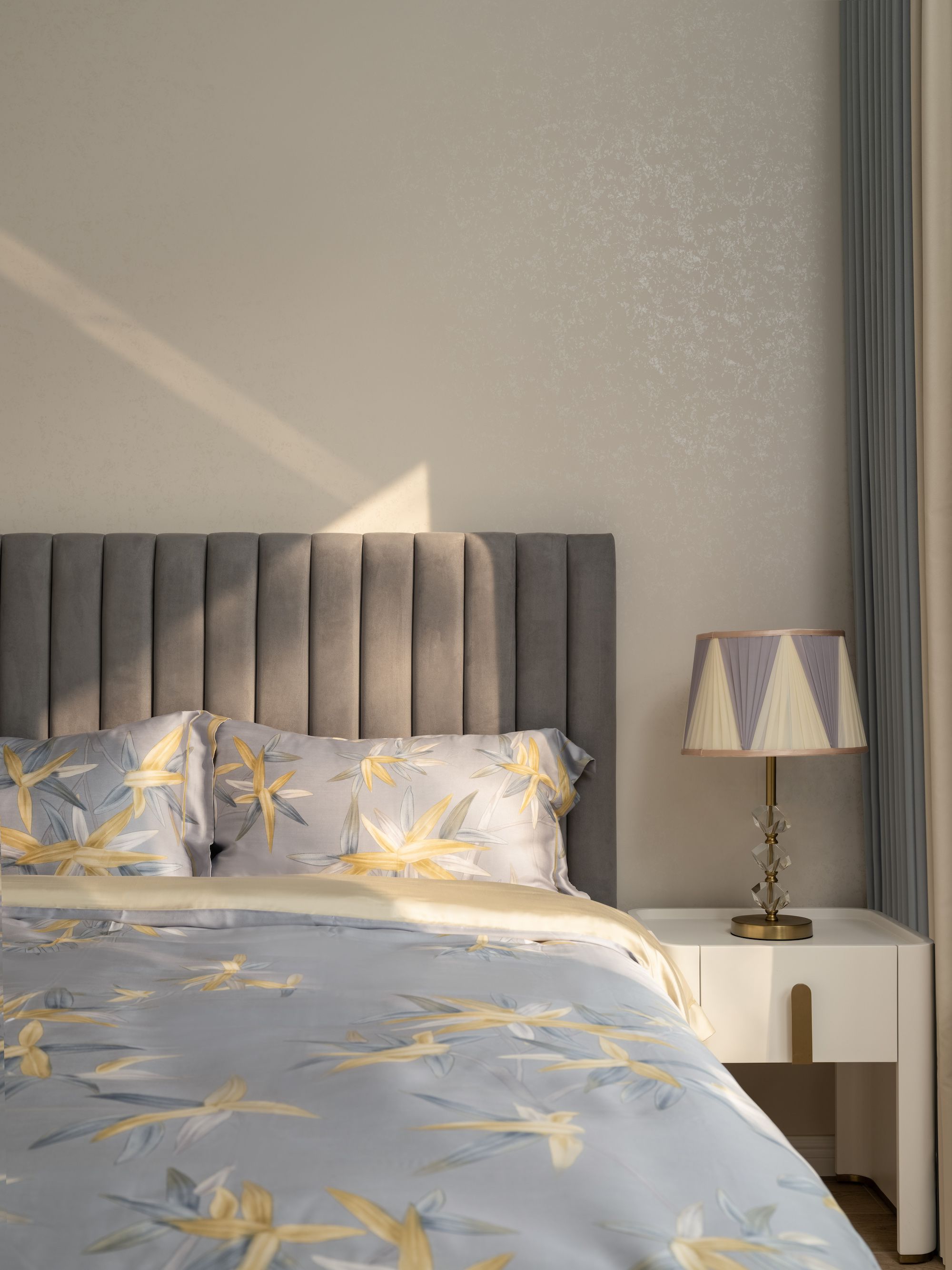 如果要给长辈房一个音调,设计师认为这个空间的调子是悠扬而怡人的。因此,在休憩功能之余,设计师解构方与圆的意象美学,让空间成为涵容长辈志趣与精神的舒适空间。片片贝壳攒簇而成的艺术灯饰,投下优雅的光晕,居者陶醉于身心舒然的氛围中。