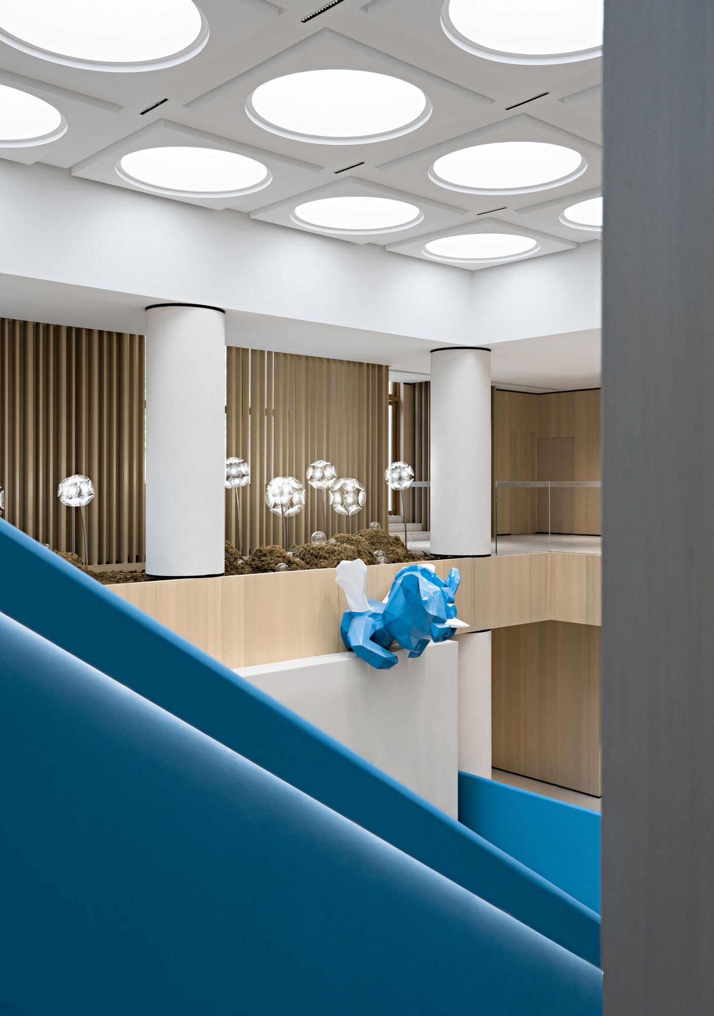 随空间深入,二十扇玻璃天花灯映入眼前,形塑出明媚开朗的空间格局。与此同时,远处的Z形蓝梯,化为独角兽LILI着陆的岛屿,分布至墙体各处,在以活力蓝呼应云岛的主题之余,以跳脱而出的姿态打破规整平面,进一步丰富浮屿巡游的趣味逻辑。