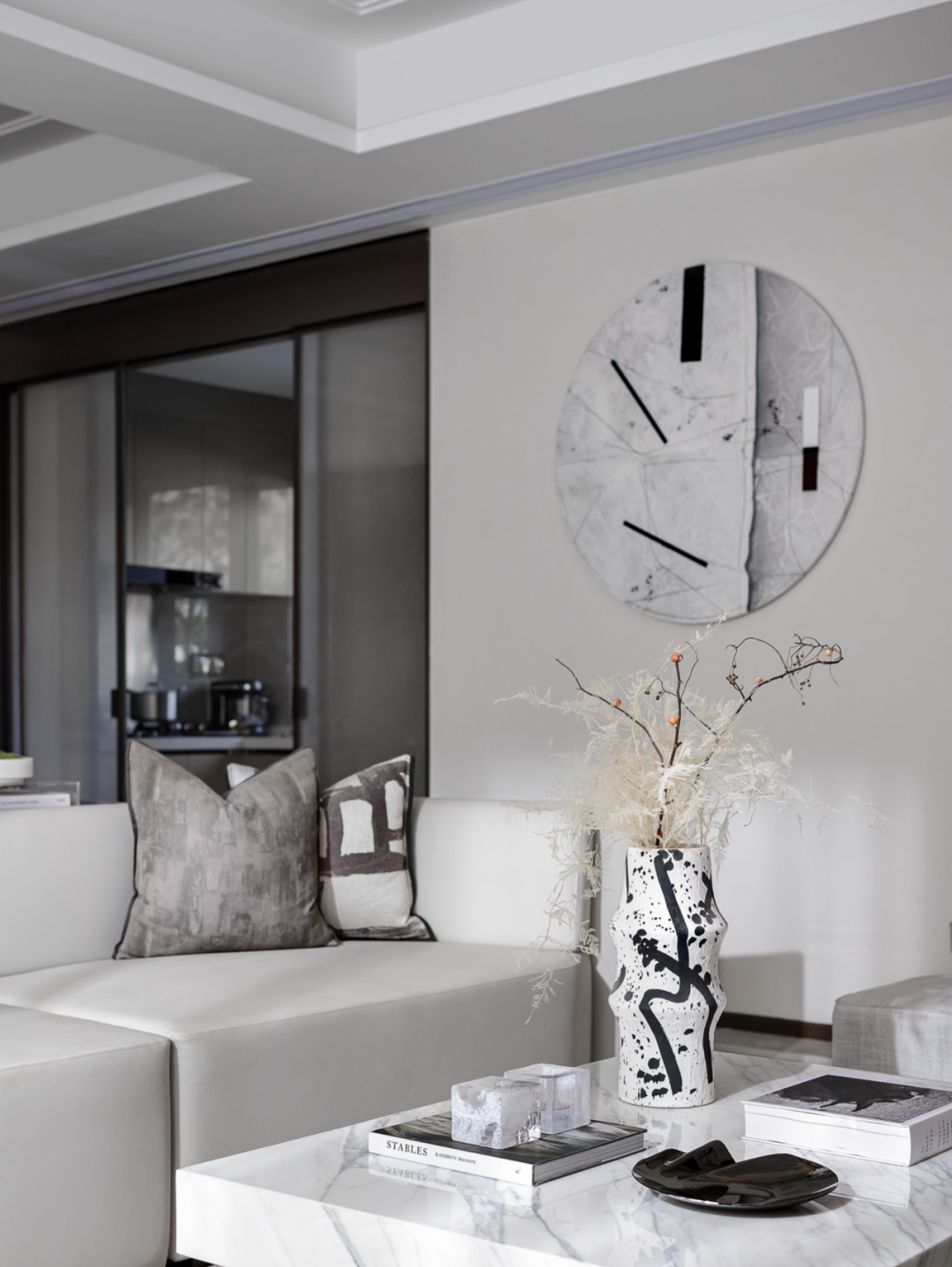 运用现代设计手法,将具有东方水墨意境的黛绿点缀入黑白灰的基调,巧妙平衡与协调颜色、比例、材质,逐步构造和丰富空间层次的同时,引东方风雅入居室。
