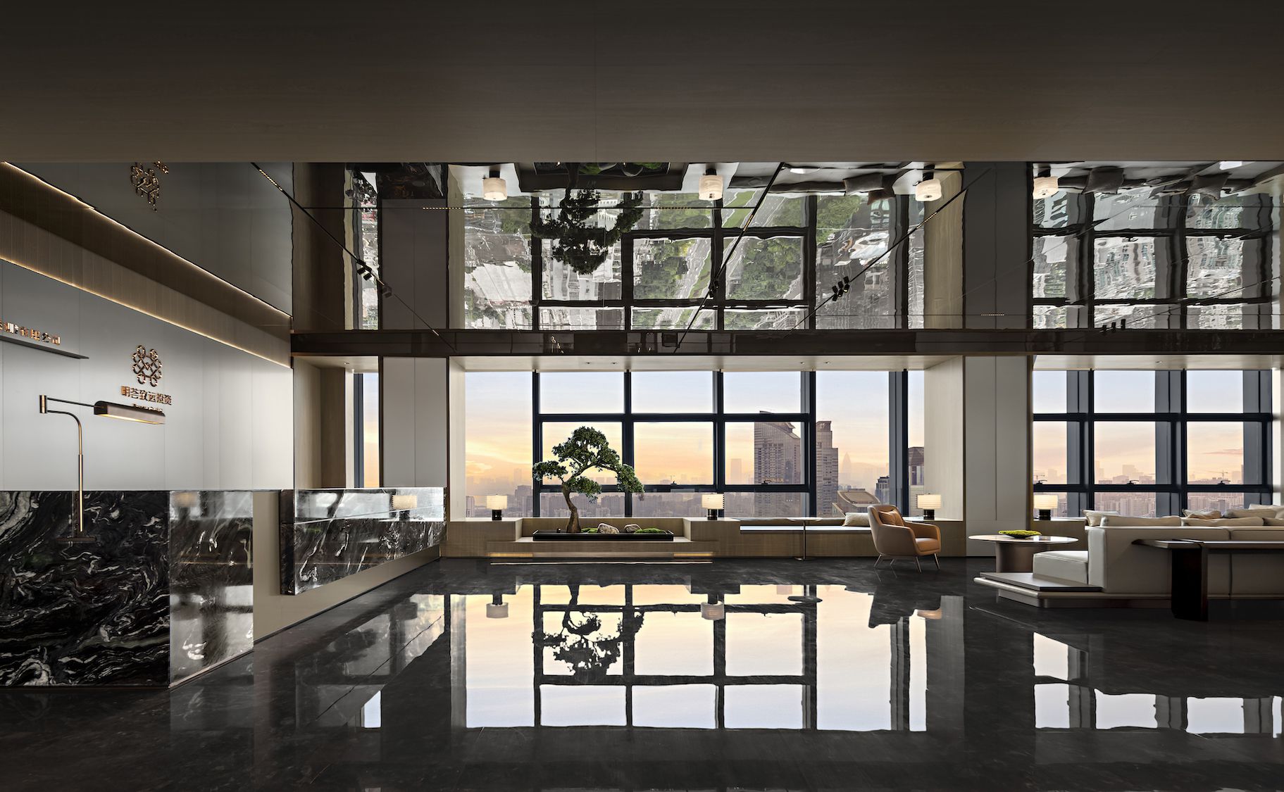 向外观望,入目是高楼林立的窗外盛景;向上仰望,是因时而异的自然百变云彩;向下俯瞰,是车水马龙的交通中枢;向远处看,山与海的边界渐渐模糊......设计以城市为幕布,以繁华为背景,将空间视觉尺度无限拉长,升华商务格调之外,更显前瞻高度。