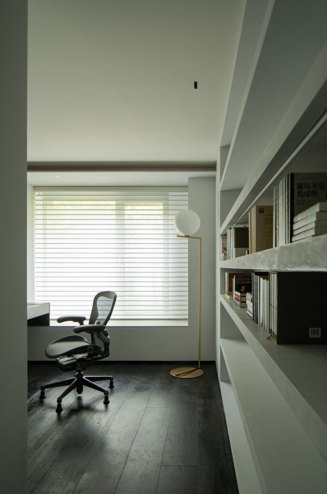 “男女主人,平时大多数时间在家里办公,需要一个安静、私密、独立的沉浸式工作间。”工作之余,书房是他们浸心阅读的二人空间,日常修心养性、陶冶精神的乐趣,在书香谧境中一一实现。