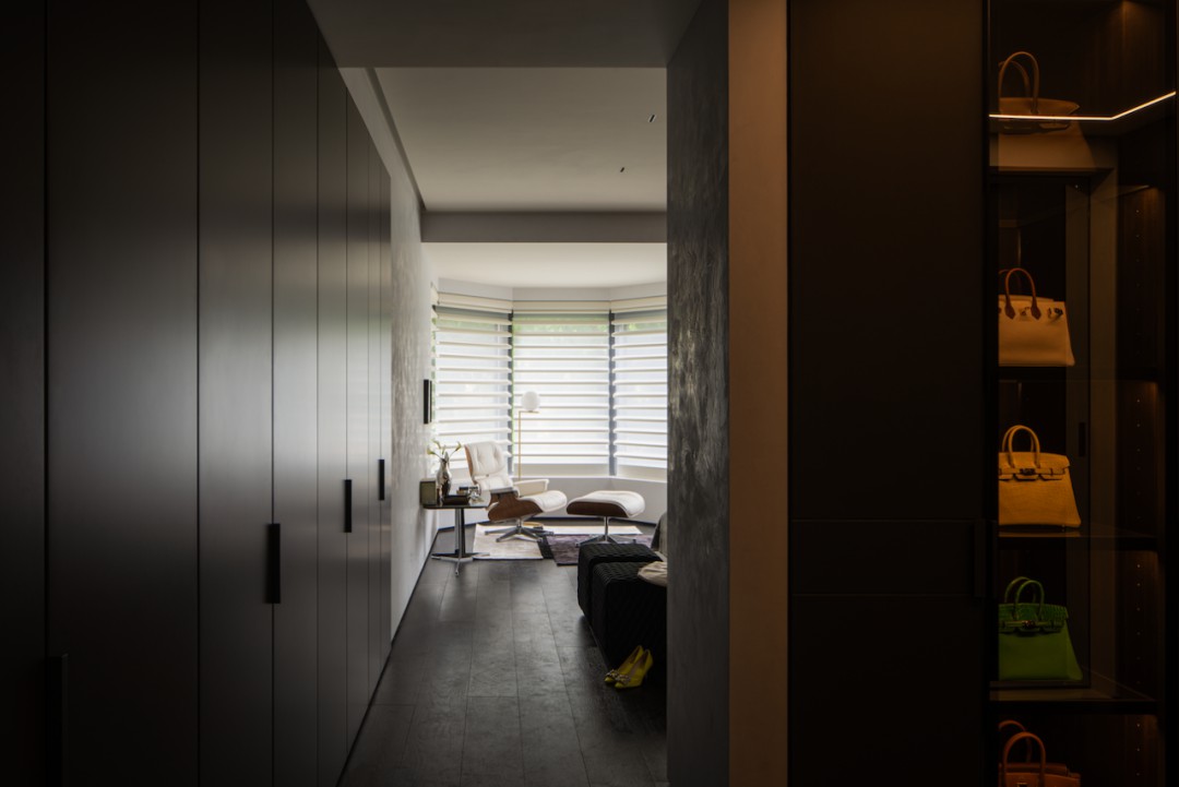 应业主的需求,主卧是纯粹的休憩空间,是卸下身体的疲惫、安安心心入眠的居心地。在克制的形式下,空间格局藏风聚气,加之雅灰色调,予人紧紧包裹身心的安全感,浸入梦境。