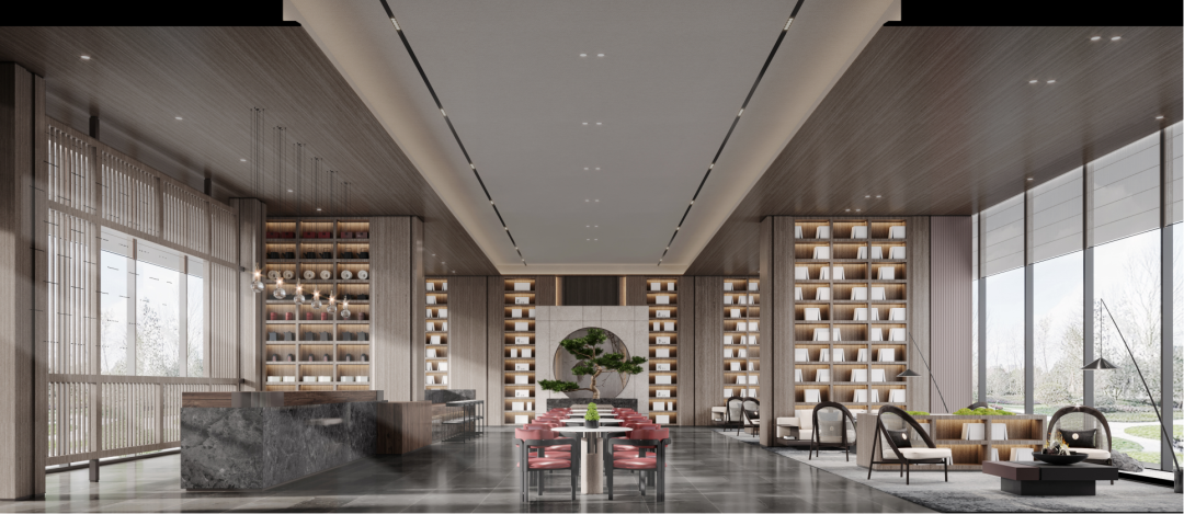 入口迎客松将自然山水引入室内,传承千年历史文化底蕴,移步易景,层层递进,将室内枯山水与室外景观相融合,涵盖了丰富的人文寓意与人文情怀,更有奋发向上的精神,给空间增添活力,尽显浓郁的东方之美。