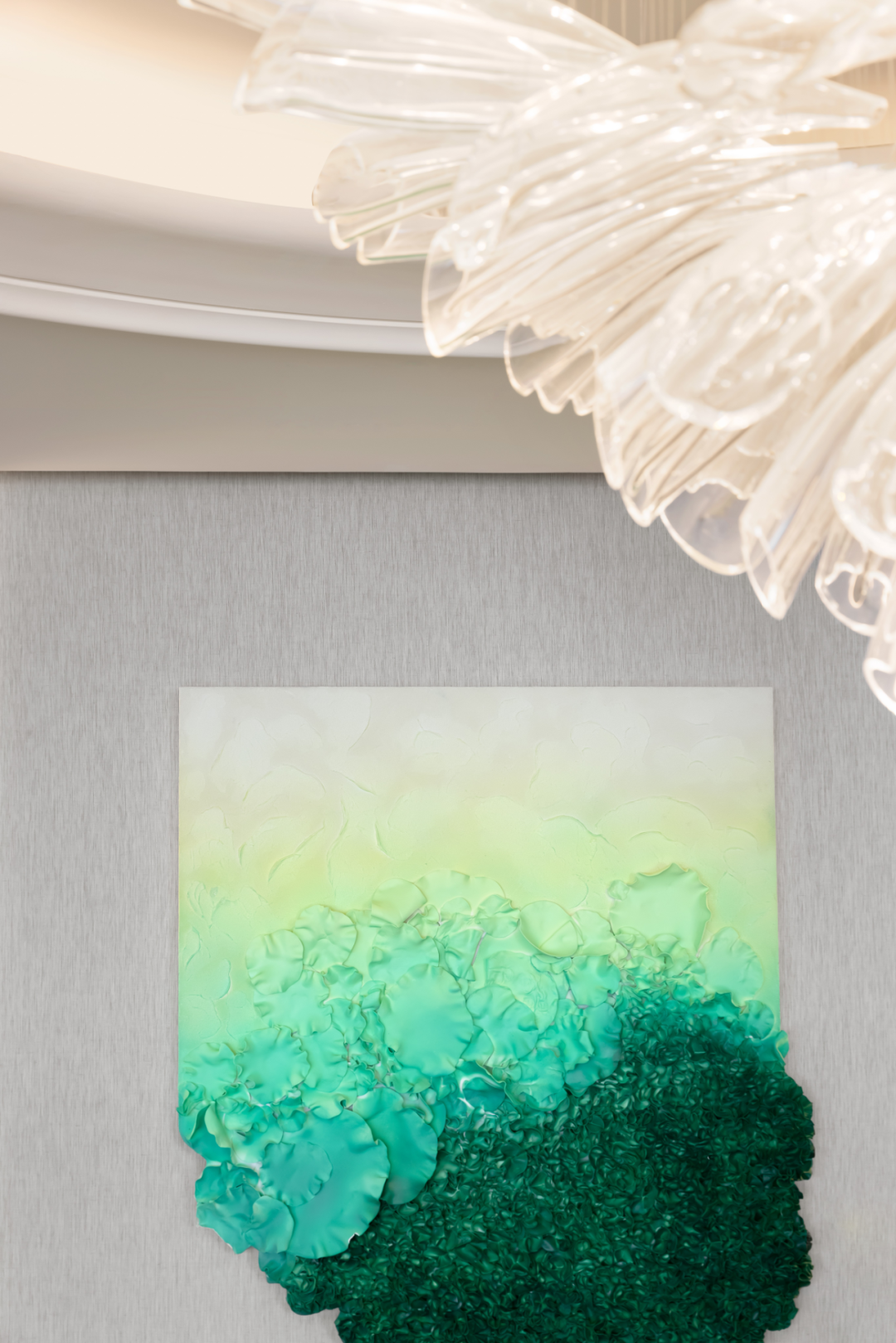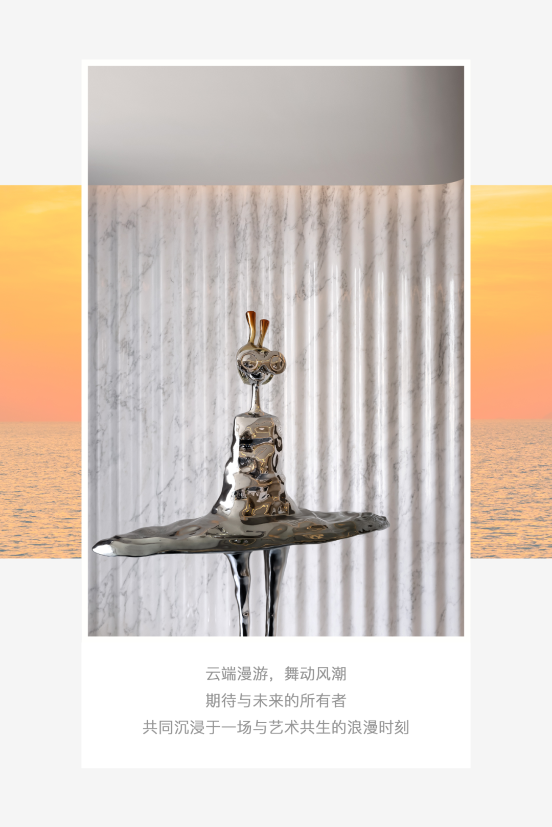 滨江·海潮望月城以「艺术品为空间诞生」为创作主轴,舞动风潮为视觉灵感,延伸至各场景的艺术与家居产品设计。从项目客群定位出发,立足城市、景观、人居,引「云」为发想,延续一贯的东方都会美学,抵达居者的精神栖居;以「潮」为感知,凭借对潮流的预见性,用艺术唤起生活中的情感和想象。