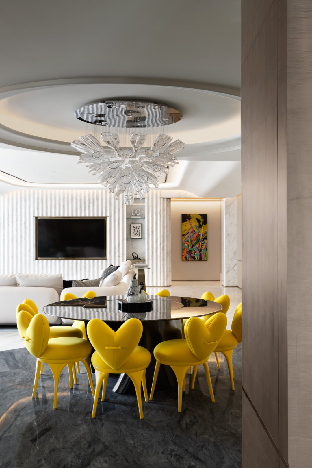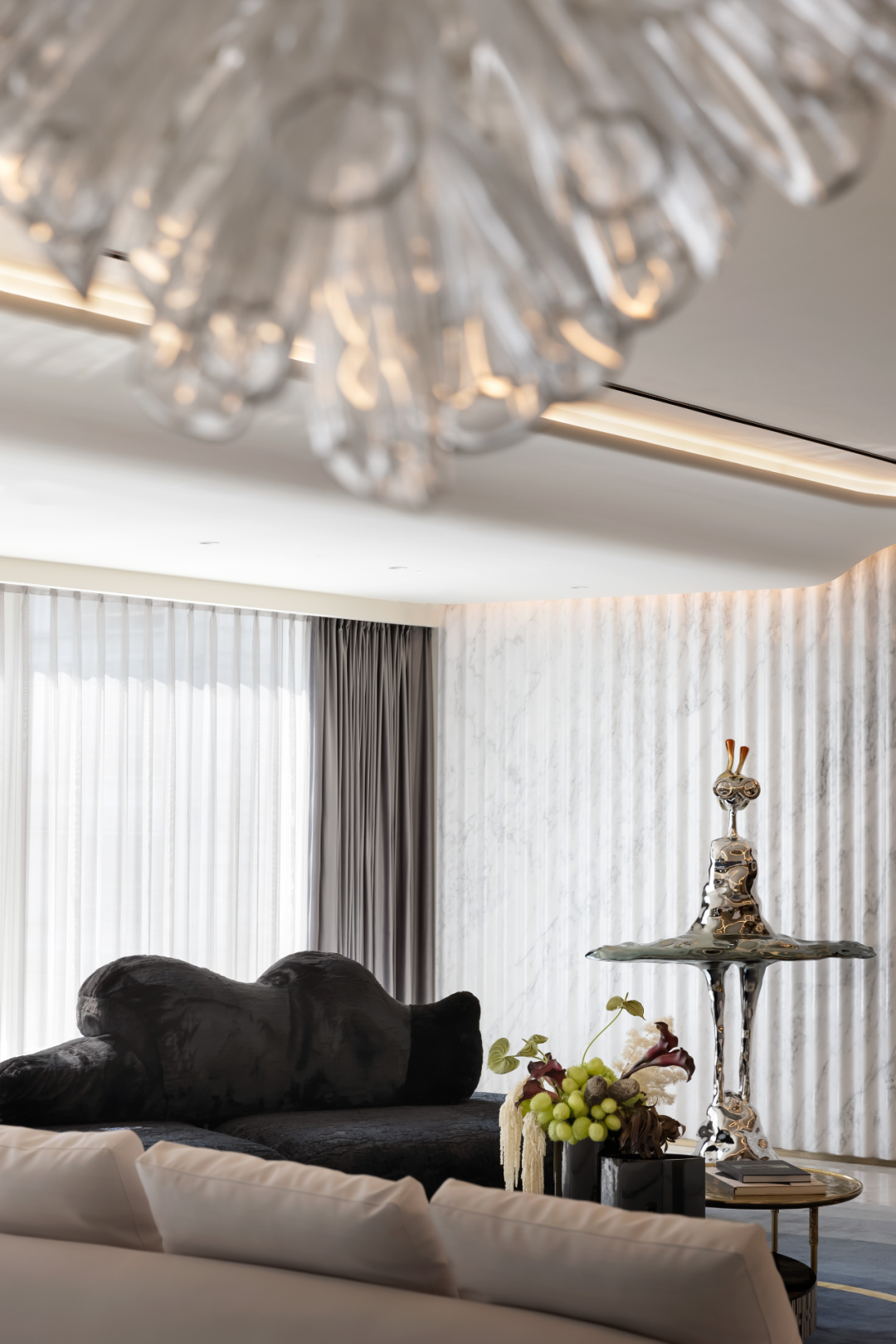 客厅背景墙融入水波流动般的曲面造型,转角处的圆弧处理,室内材质的对比呈现,大理石材的多样纹理、艺术家具的色彩碰撞,运用梦幻、艺术、时尚元素,共同延续新装饰主义NEO ART DECO精神。