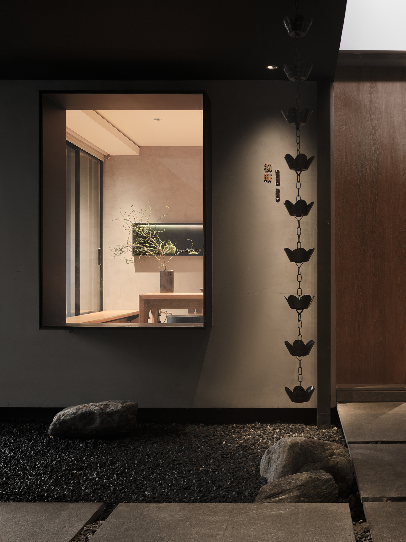诗情圆月、清冷雪松、苍翠苔藓,在朴拙墙面肌理的映照下,更显一份自然的静美。一侧挂画的陈列,在传统美学的渗透间,注入现代艺术的秩序,驻足观赏间,东方与当代的默契,相得无间,共同为空间造境。