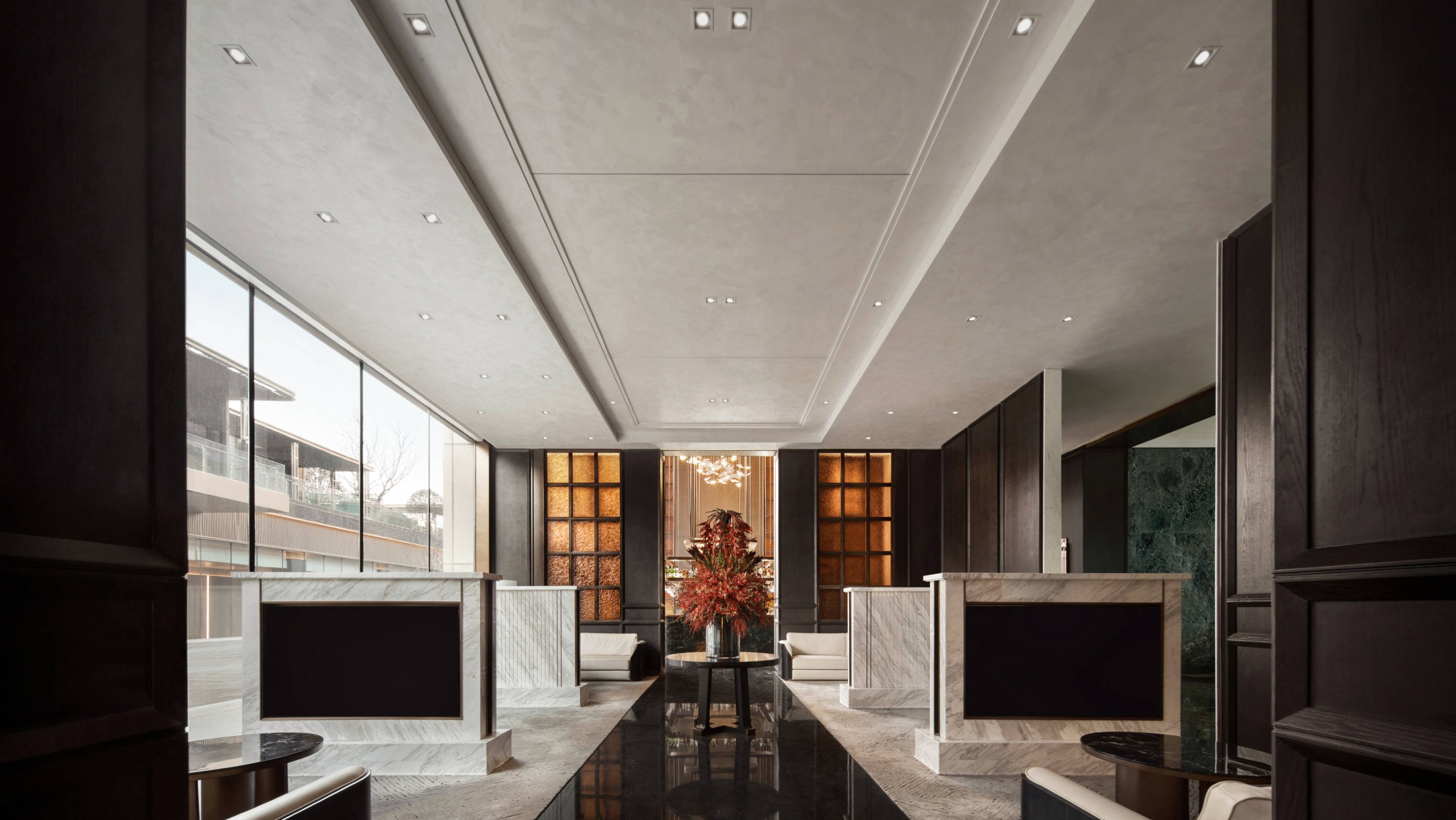 前厅做为访客首次进入的空间,整体大气奢华又不失精致素雅。左右设置了品牌展示区和进入会所空间的电梯,交付后会做为业主归家大堂。空间以斑斓奢石、精致金属、柔和木饰面、绚丽玻璃为主要材料,赋予空间美好的肌理与刚柔并济的平衡感。塑造高奢品质氛围。