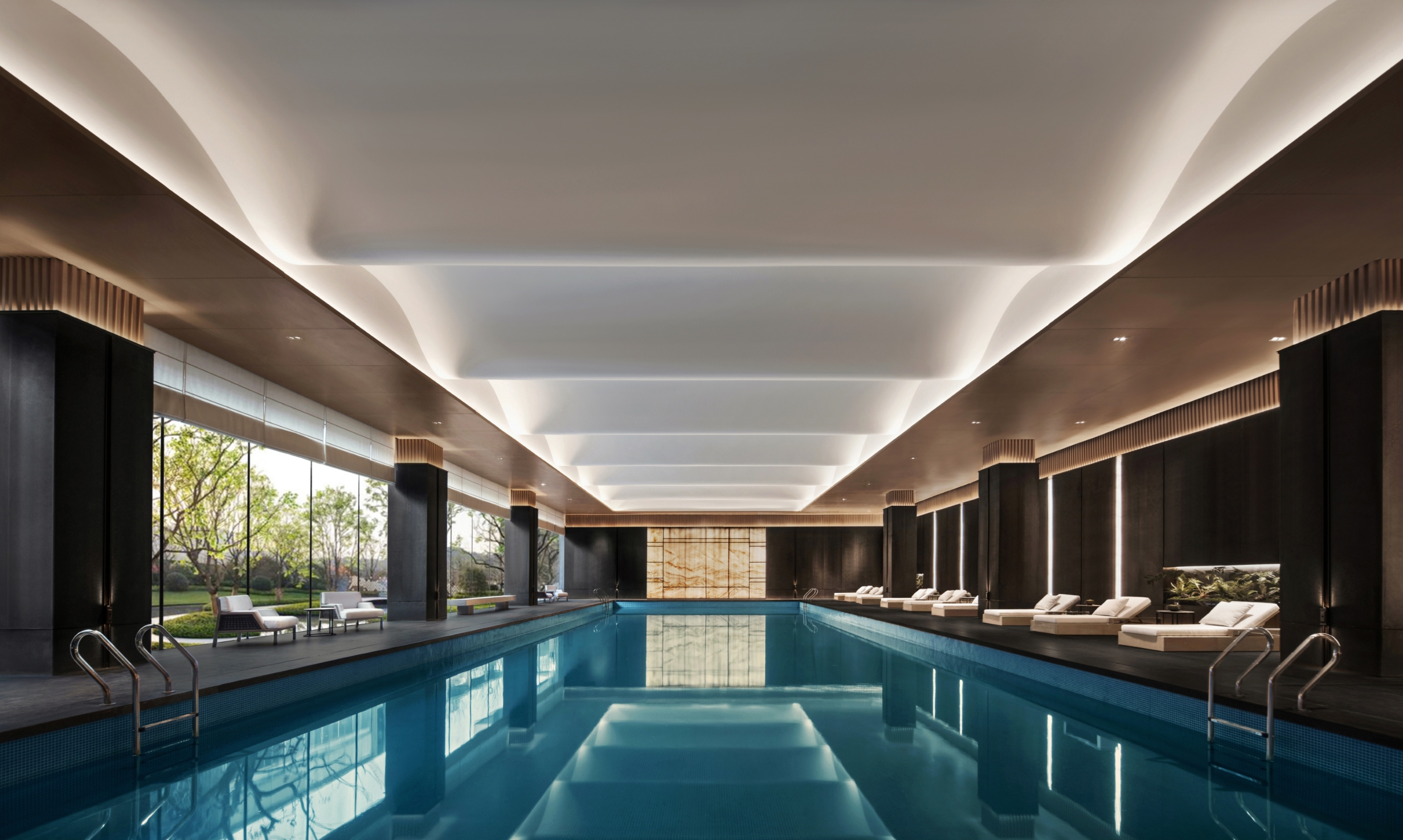 泳池顶面波浪形吊顶强调氛围感,通过室内外透景,打造泳池与室外景观联动呼应,四季皆可肆意畅游。