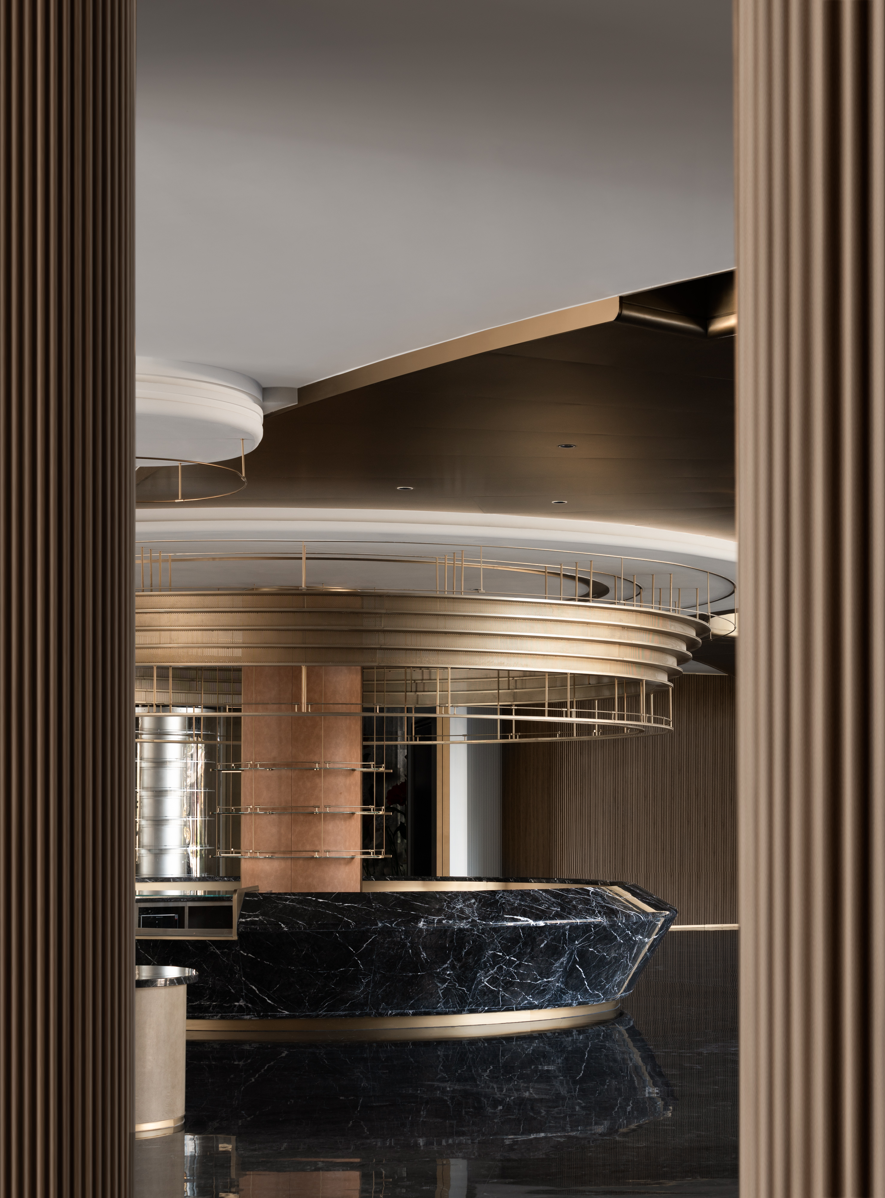 延续水吧的柔性美学,全能服务站采用弧、环形的造型设计,一系列片墙隔而不断,叠加转折,沿宾客动线而设,游刃有余地分割空间。