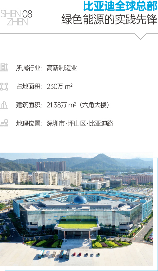 位于深圳坪山区的比亚迪全球总部工业园始建于2006年9月,是比亚迪的心脏。承接“技术为王,创新为本”的发展理念,作为研发中心和管理中枢的“六角心脏”无不体现着秩序、协调、对称的功能美学,建筑周围环伺实验室、厂房和汽车测试中心,通向未来的云轨如护城巨龙盘踞身侧,彰显着比亚迪雄厚的科研创新实力和强劲的发展势头。